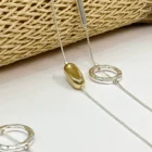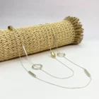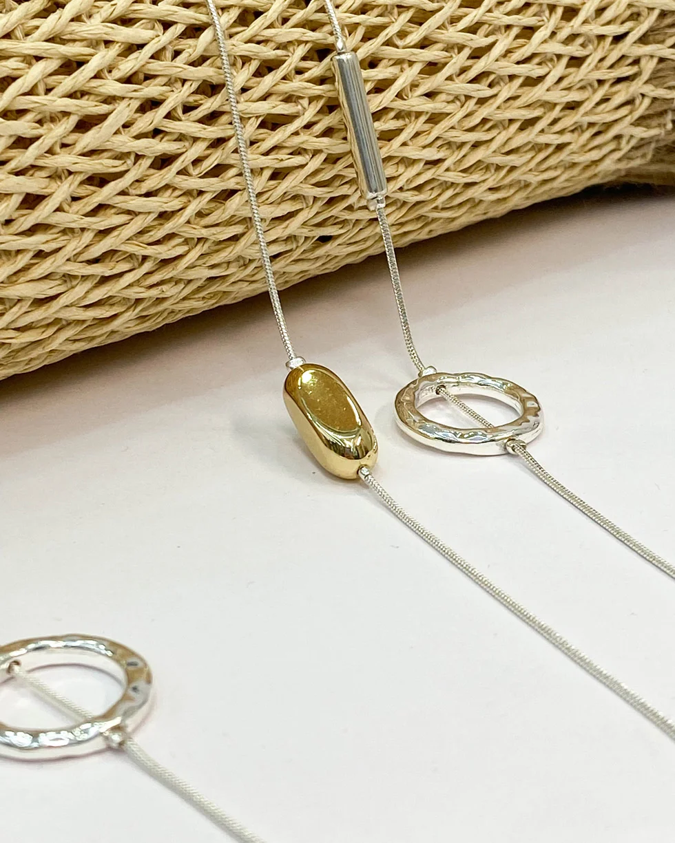 Este collar largo de diseño elegante combina la sutileza de una fina cadena plateada con detalles geométricos como son los aros circulares en tono plateado y los delicados cilindros dorados a lo largo de la cadena. Su combinación de tonos metálicos (plata y dorado) le permite que se adapte fácilmente a otros accesorios.