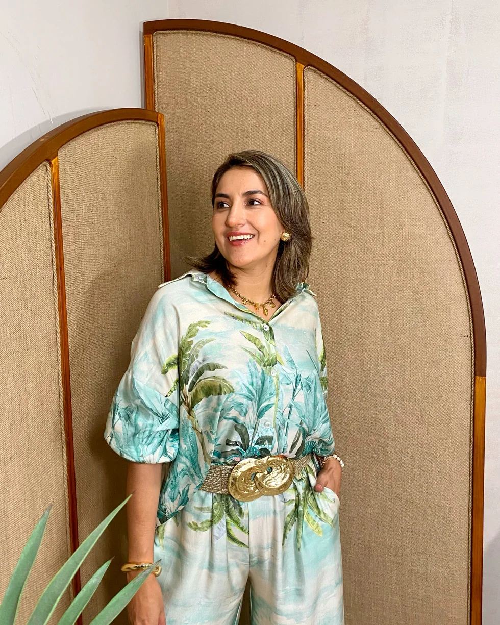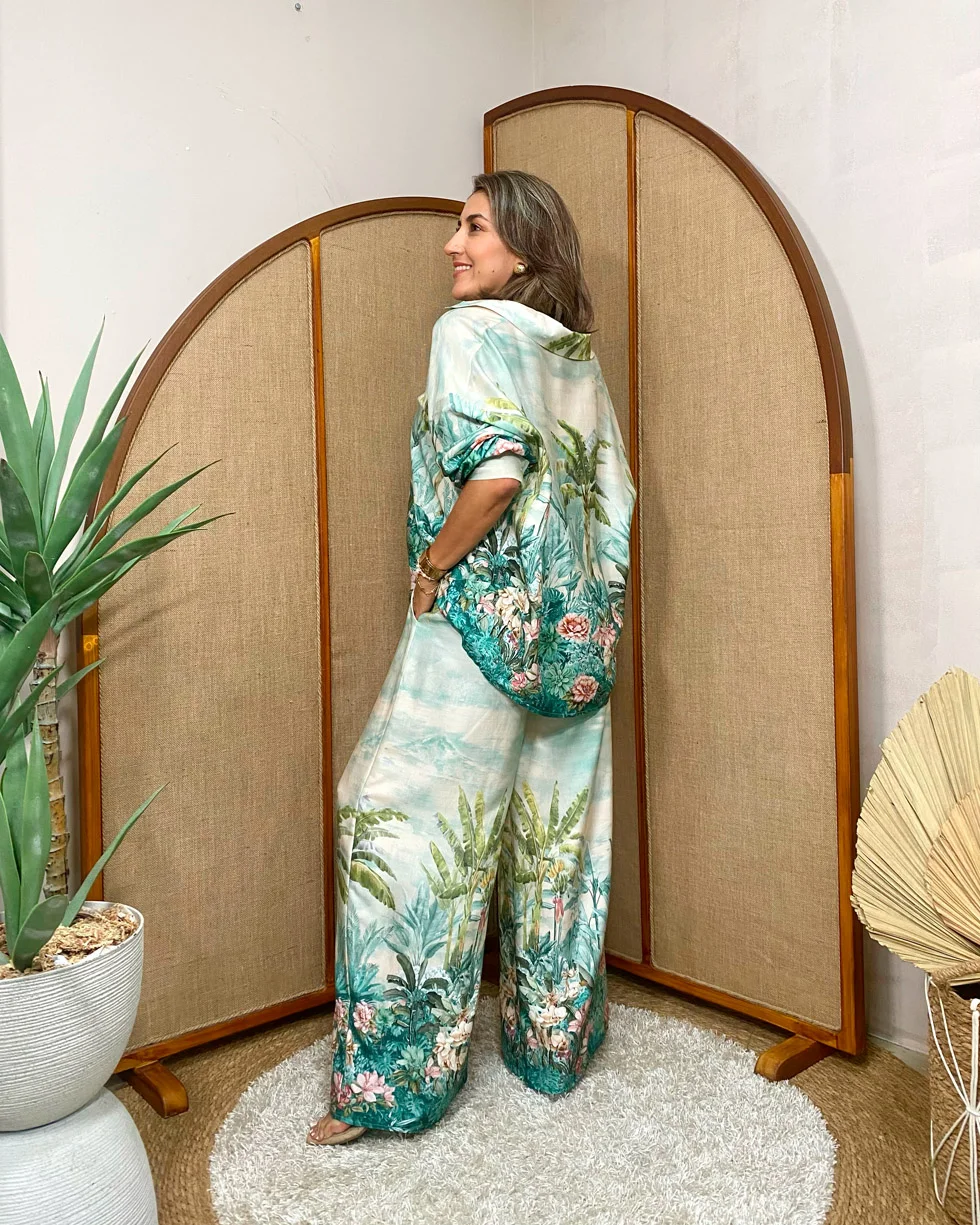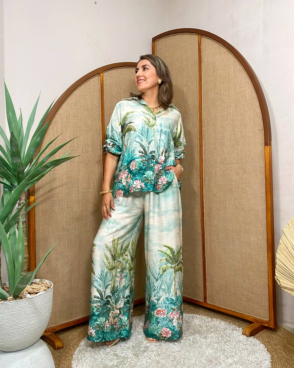 Este conjunto consta de una camisa de manga larga con botones, cuello tipo solapa y un estampado de palmeras y flores en tonos verdes, azules y rosados. Y un pantalón de pierna ancha a juego con el mismo estampado de palmeras y flores. Este conjunto es ideal para compromisos al aire libre y lo podemos combinar con accesorios dorados y espadrilles en yute.