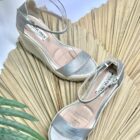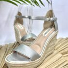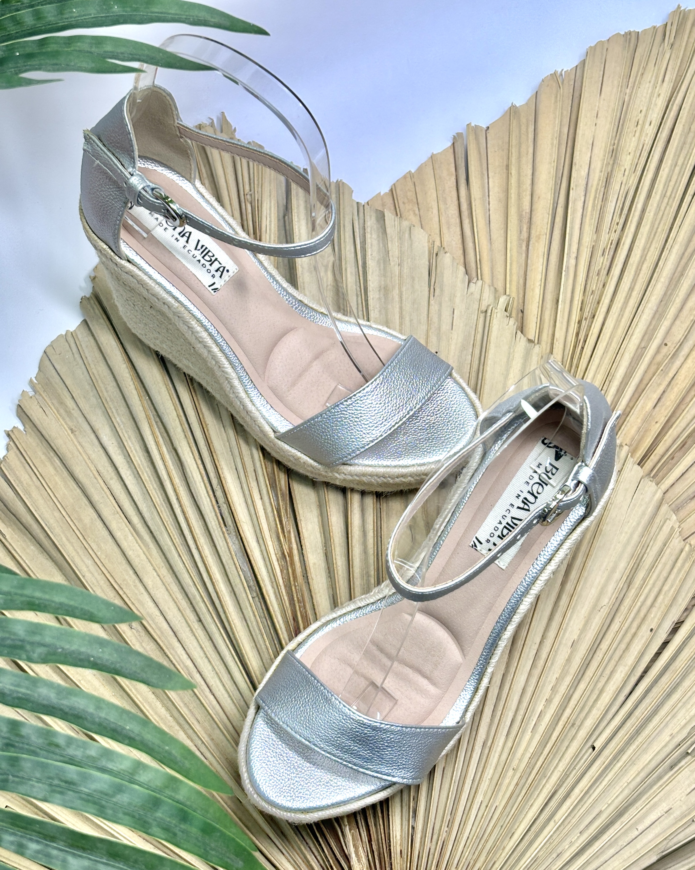 Espadrilas en tono plateado con correa ajustable y acabado en yute trenzado.