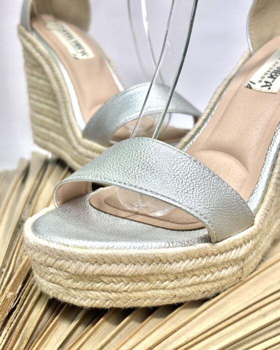 Espadrilas en tono plateado con correa ajustable y acabado en yute trenzado.