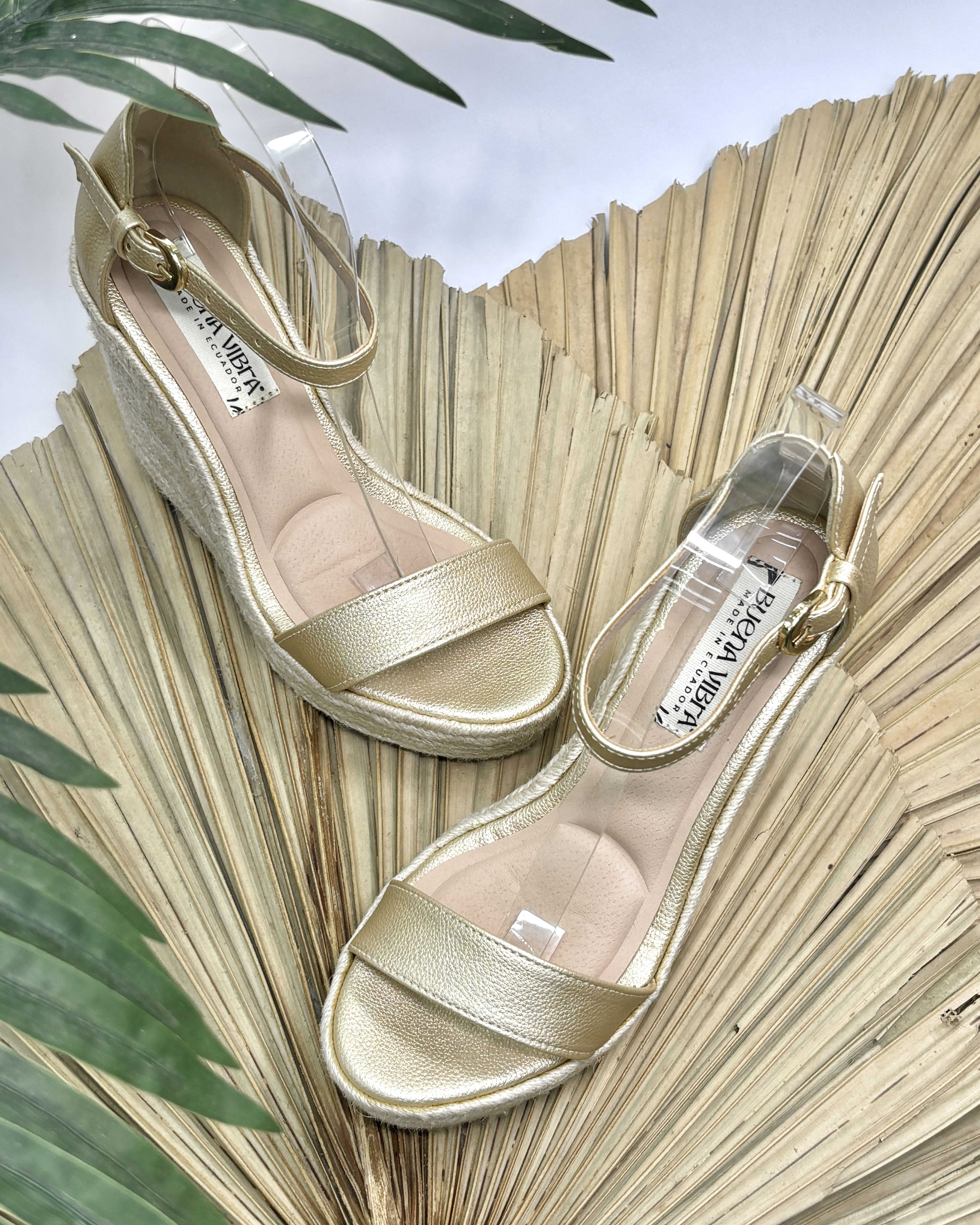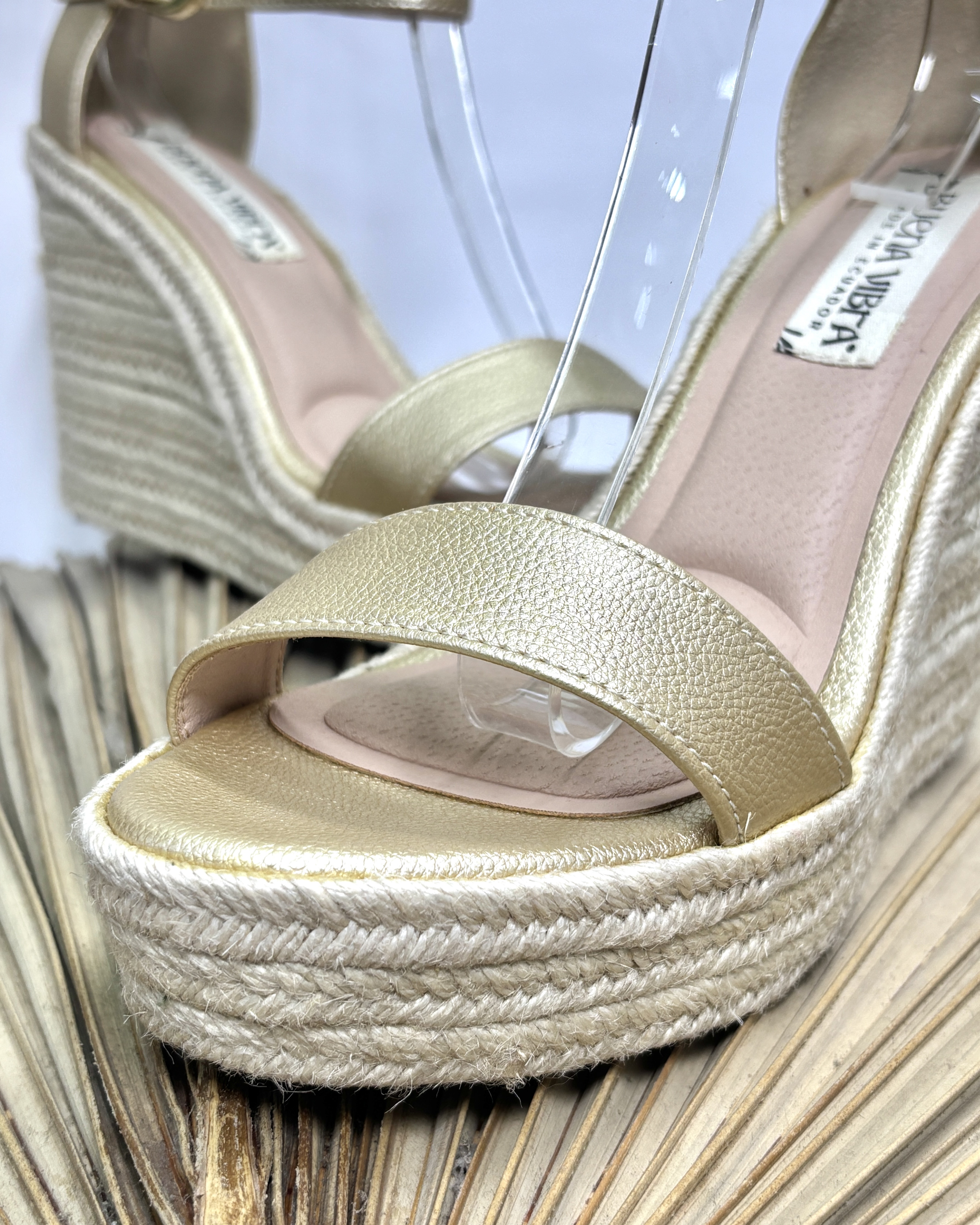 Espadrillas en tono dorado con correa ajustable y plataforma con acabado en yute natural.