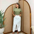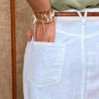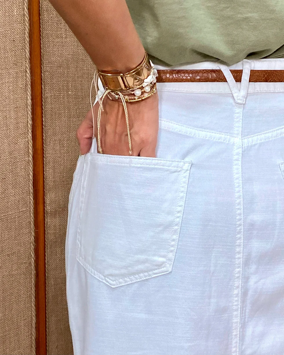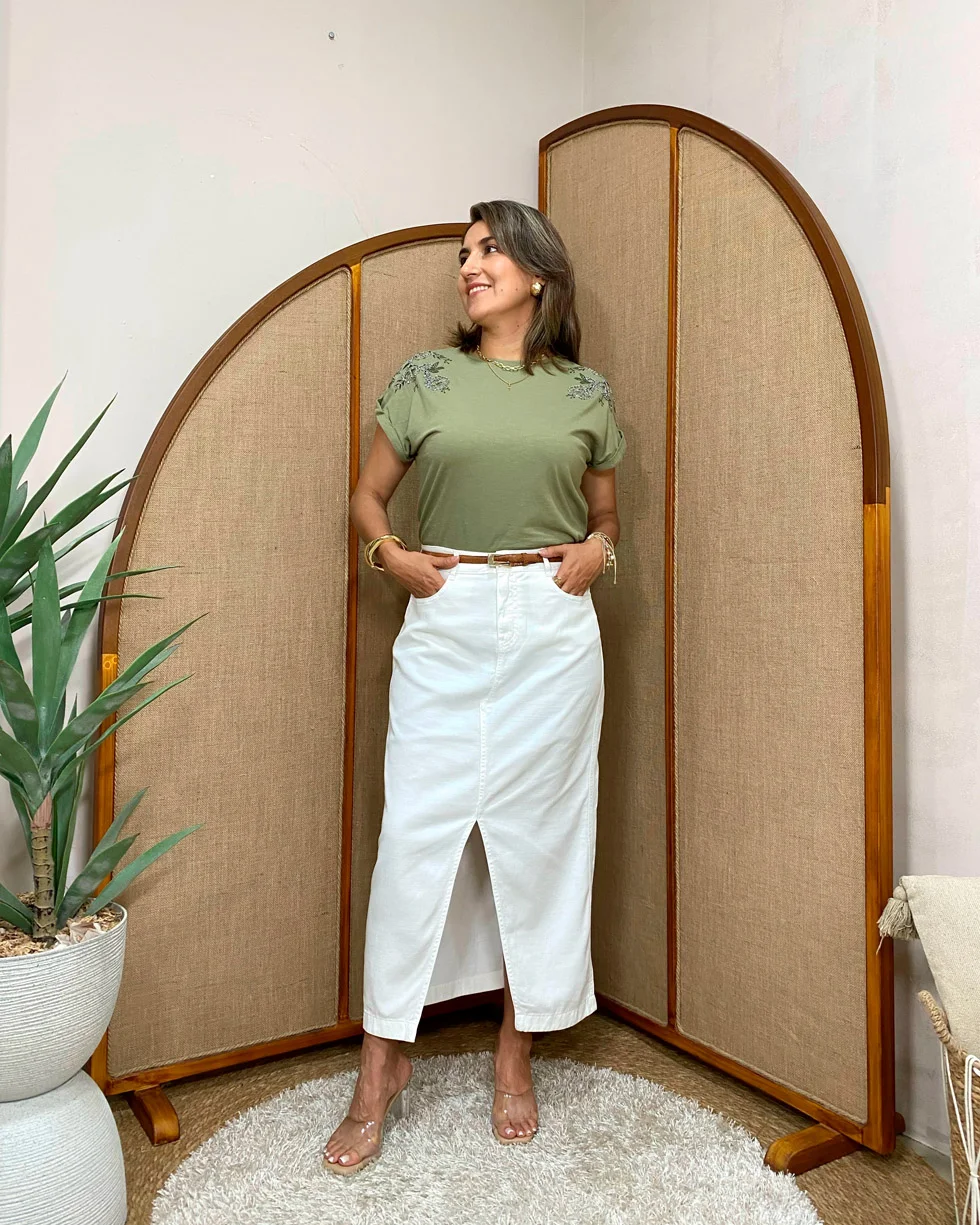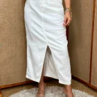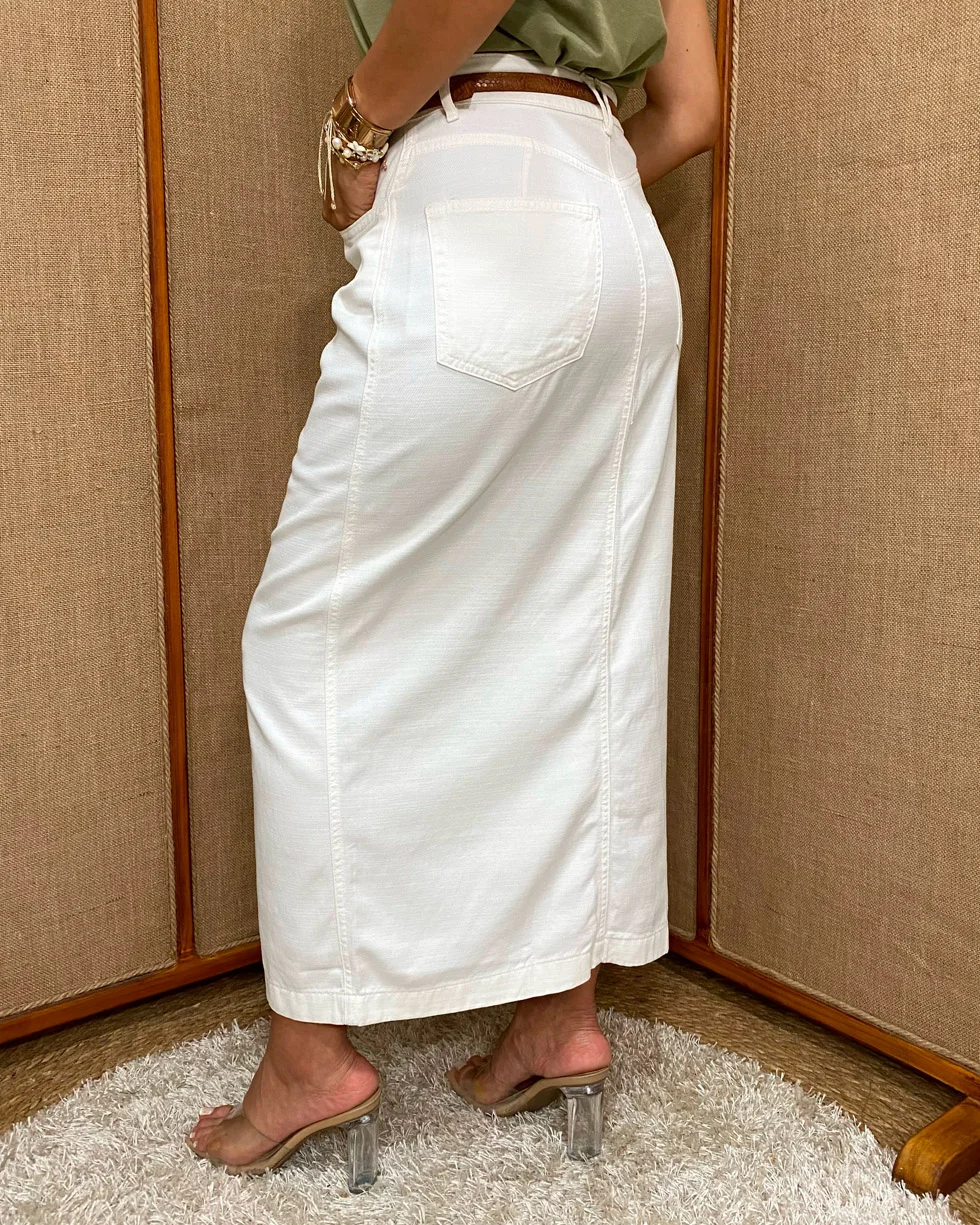 Esta es una falda corte midi en denim tono crudo. En su diseño de talle alto presenta presillas para cinturón que ayudan a realzar la silueta, mientras que la abertura frontal añade un toque femenino. Cuenta con bolsillos delanteros y traseros, lo que la vuelve una prenda súper práctica y funcional para el día a día.