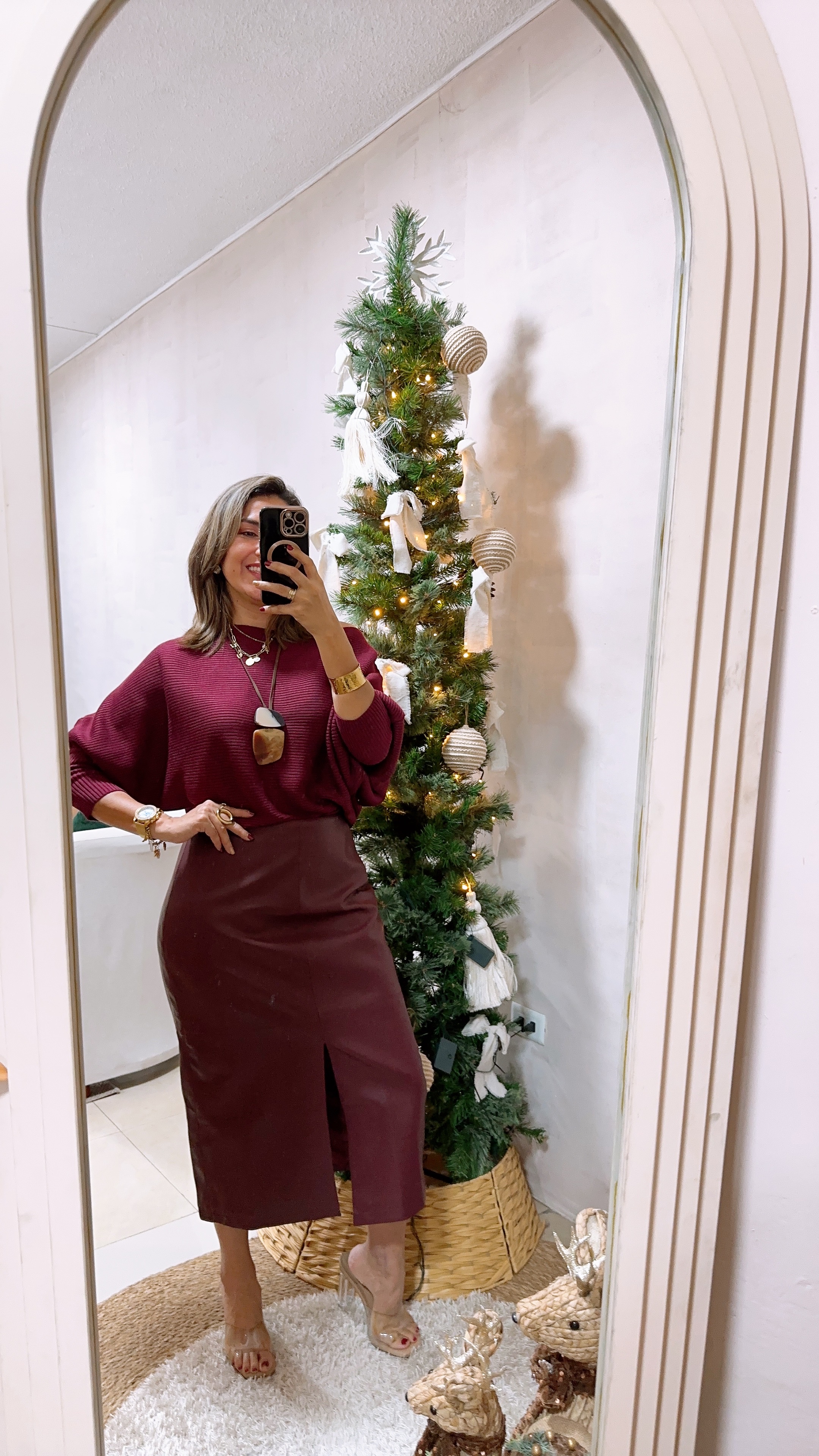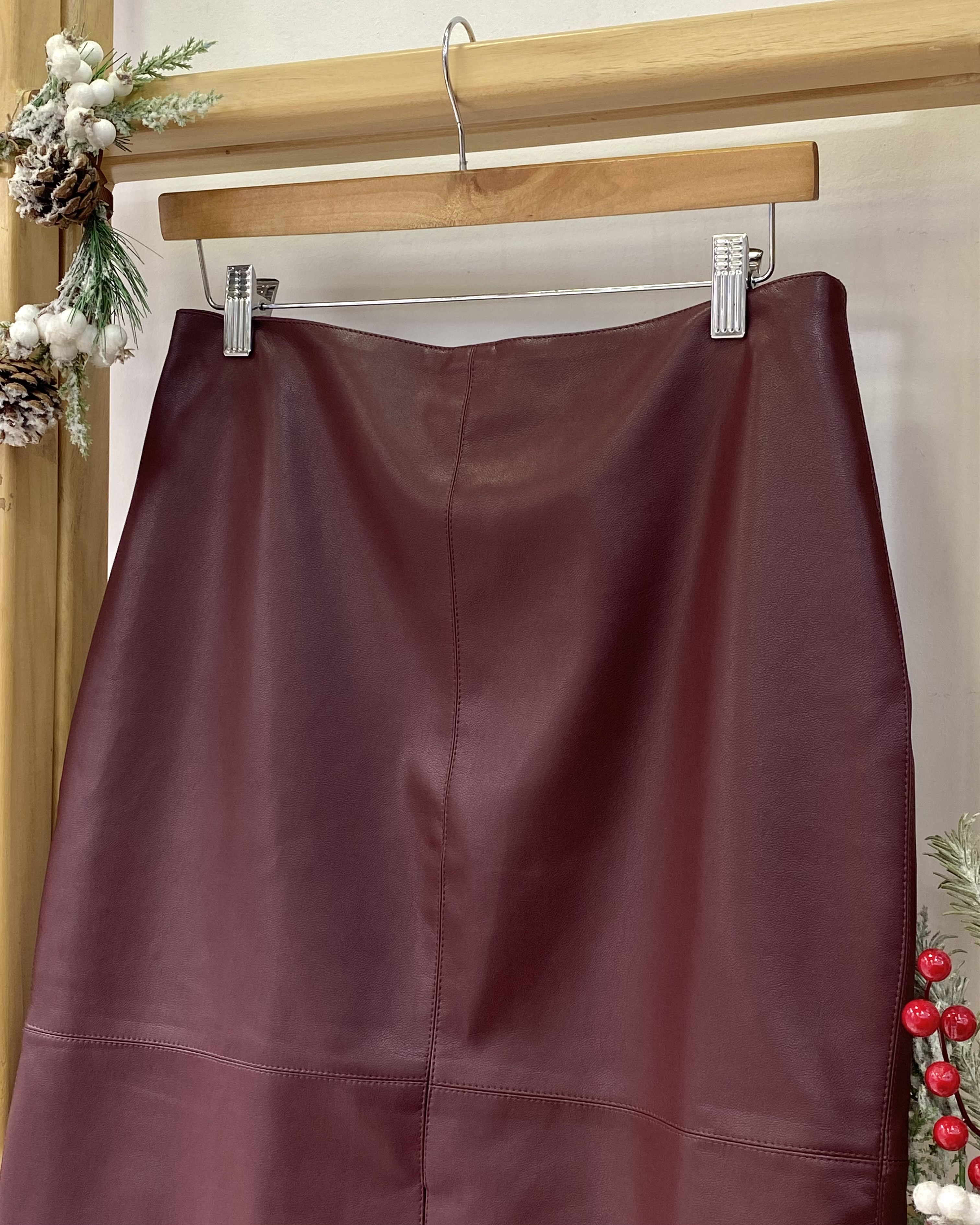 Falda efecto cuero con pinzas en la parte posterior y abertura en la parte de enfrente.