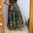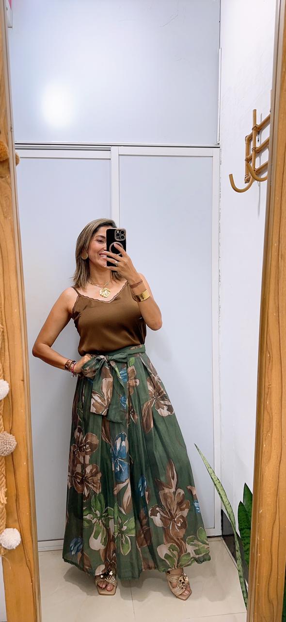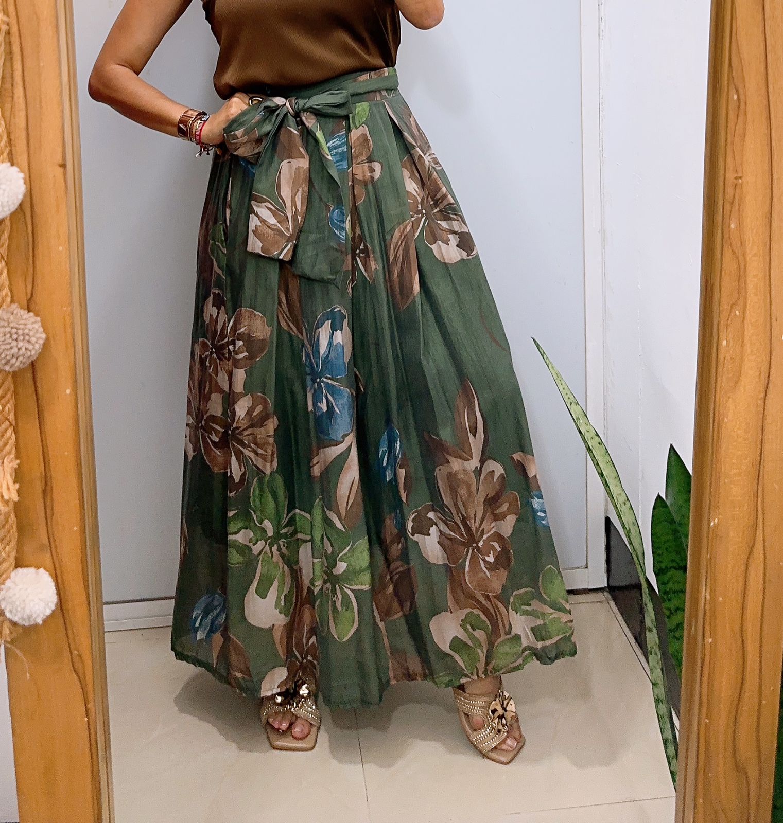 Falda maxi con elástico en pretina y presenta un cinto de la misma tela, además cuenta con forro interno y bolsillos funcionales.