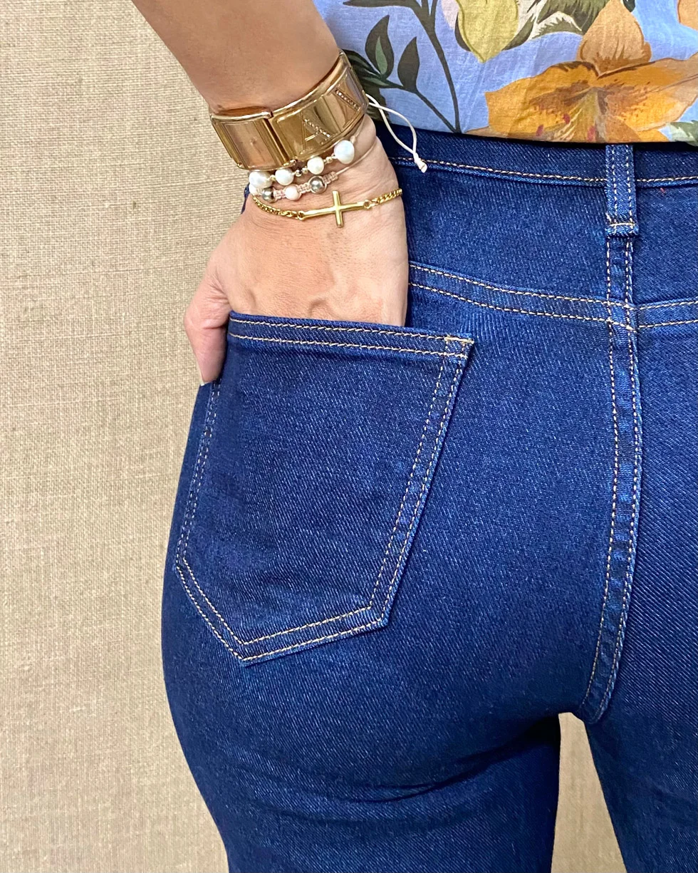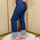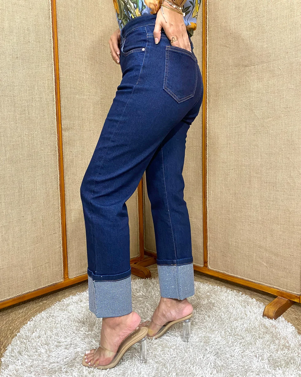 Jean azul oscuro de tiro alto con bota doblada y detalle de pedrería.