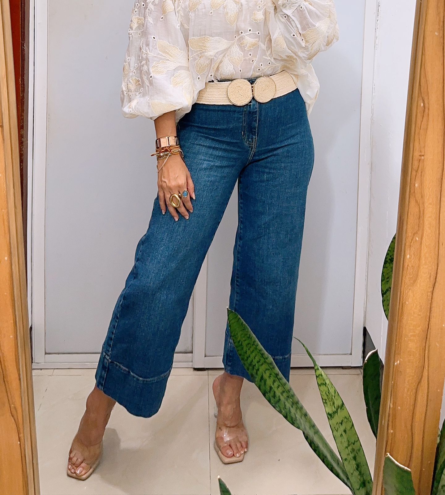 Jean culotte con bolsillos posteriores funcionales y detalle de doblez ancho en la basta.