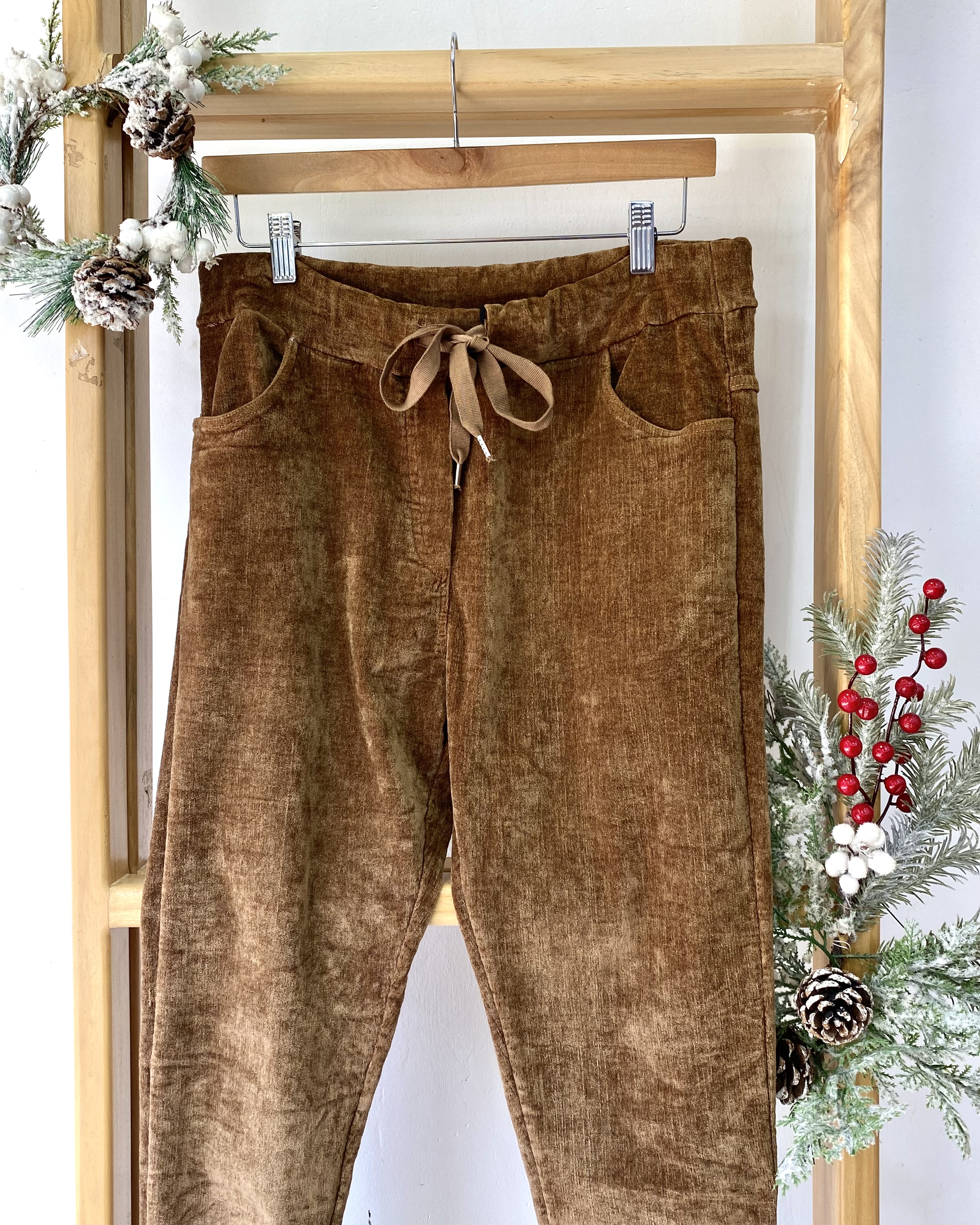 Jogger con amarre en cintura y bolsillos funcionales textura micro pana efecto gamuza.