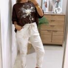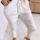 Jogger con elástico en pretina y cordón para amarrar, además presenta flores bordadas en toda la prenda y detalles en lentejuelas.