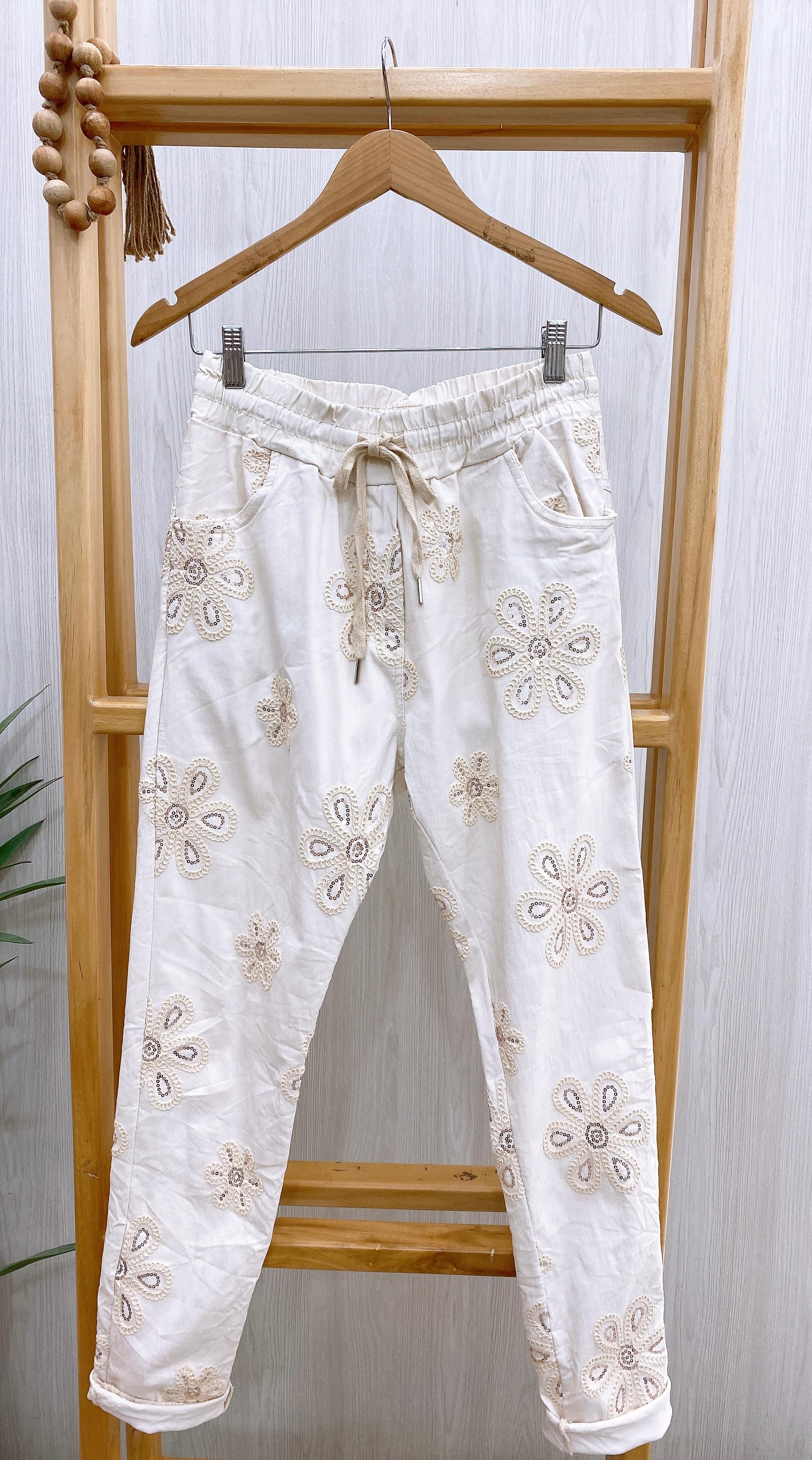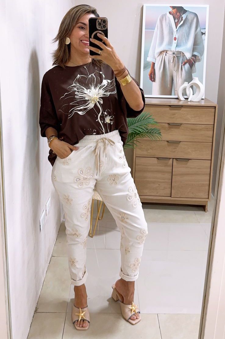 Jogger con elástico en pretina y cordón para amarrar, además presenta flores bordadas en toda la prenda y detalles en lentejuelas.