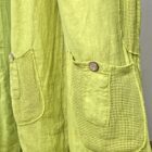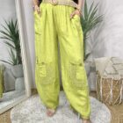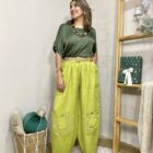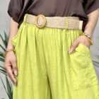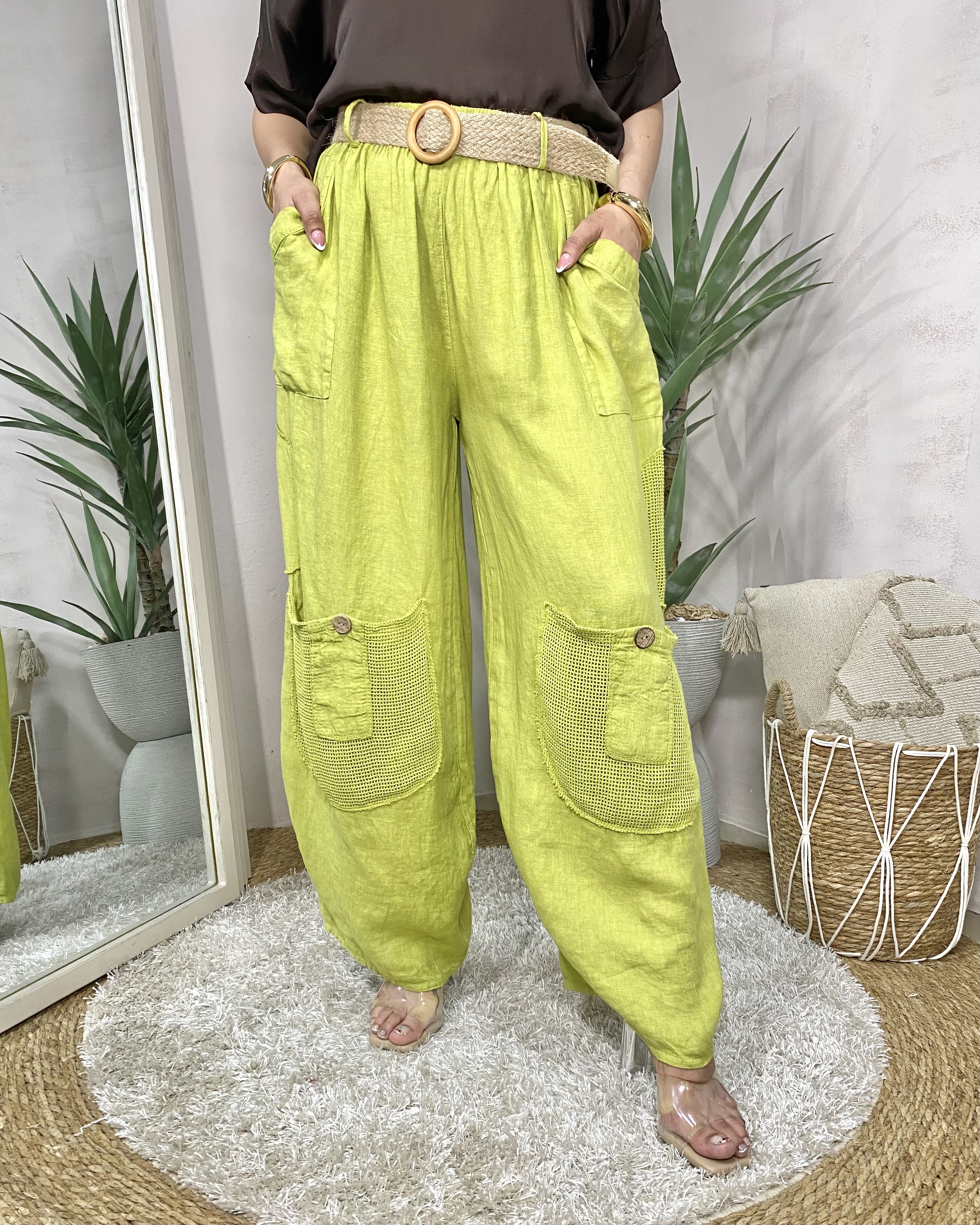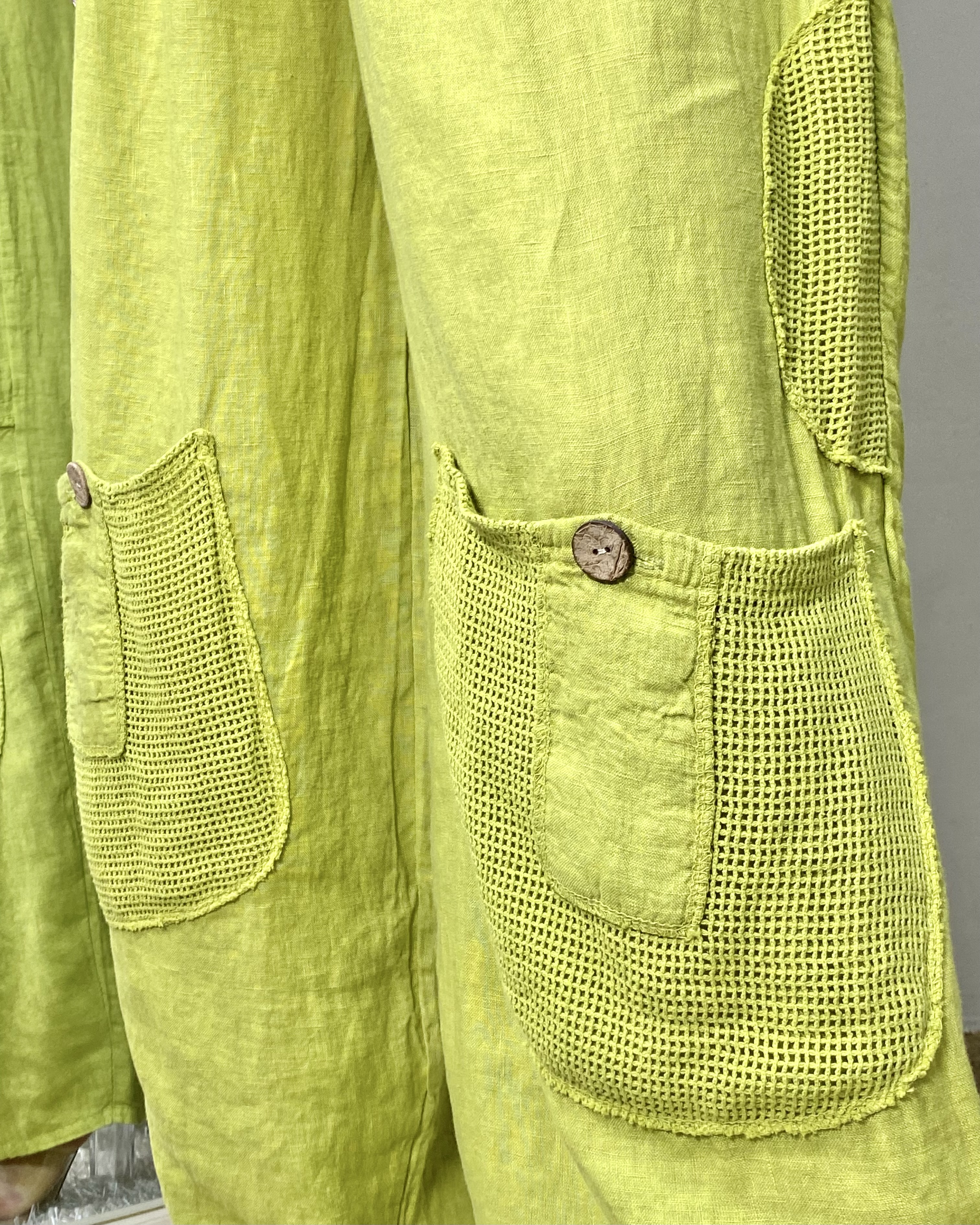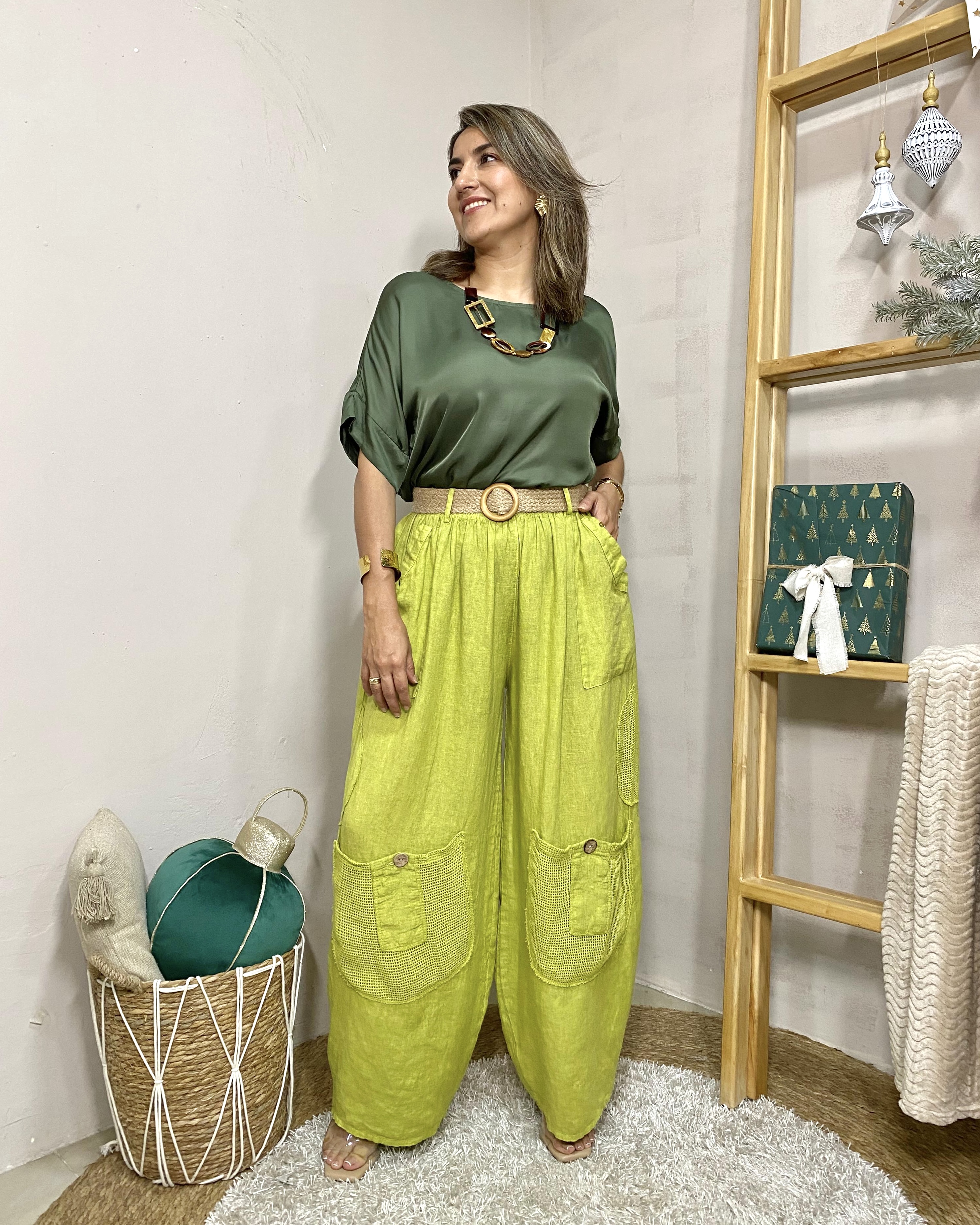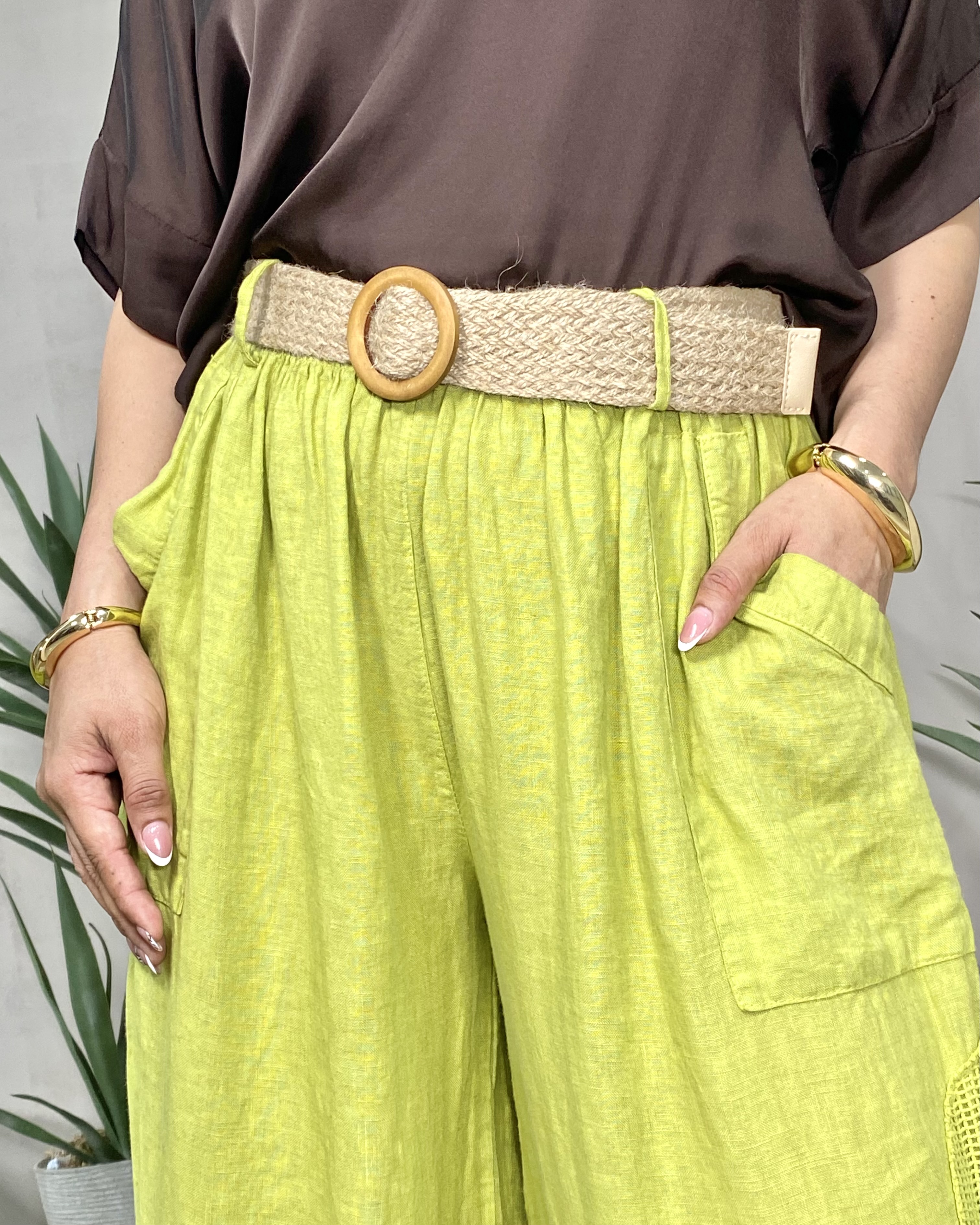 Palazzo verde pistacho con bolsillos de malla, estilo relajado y moderno.