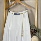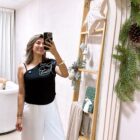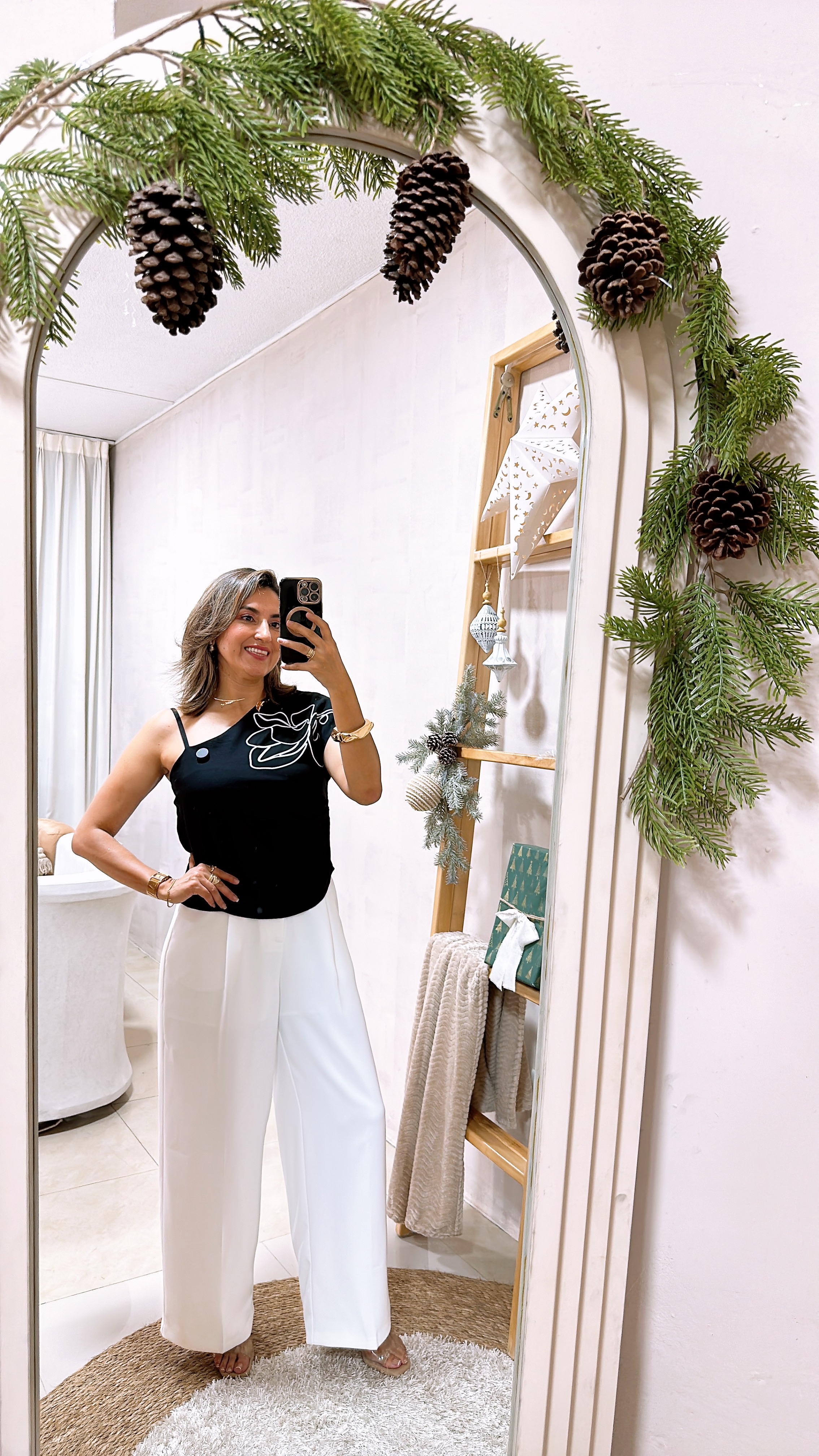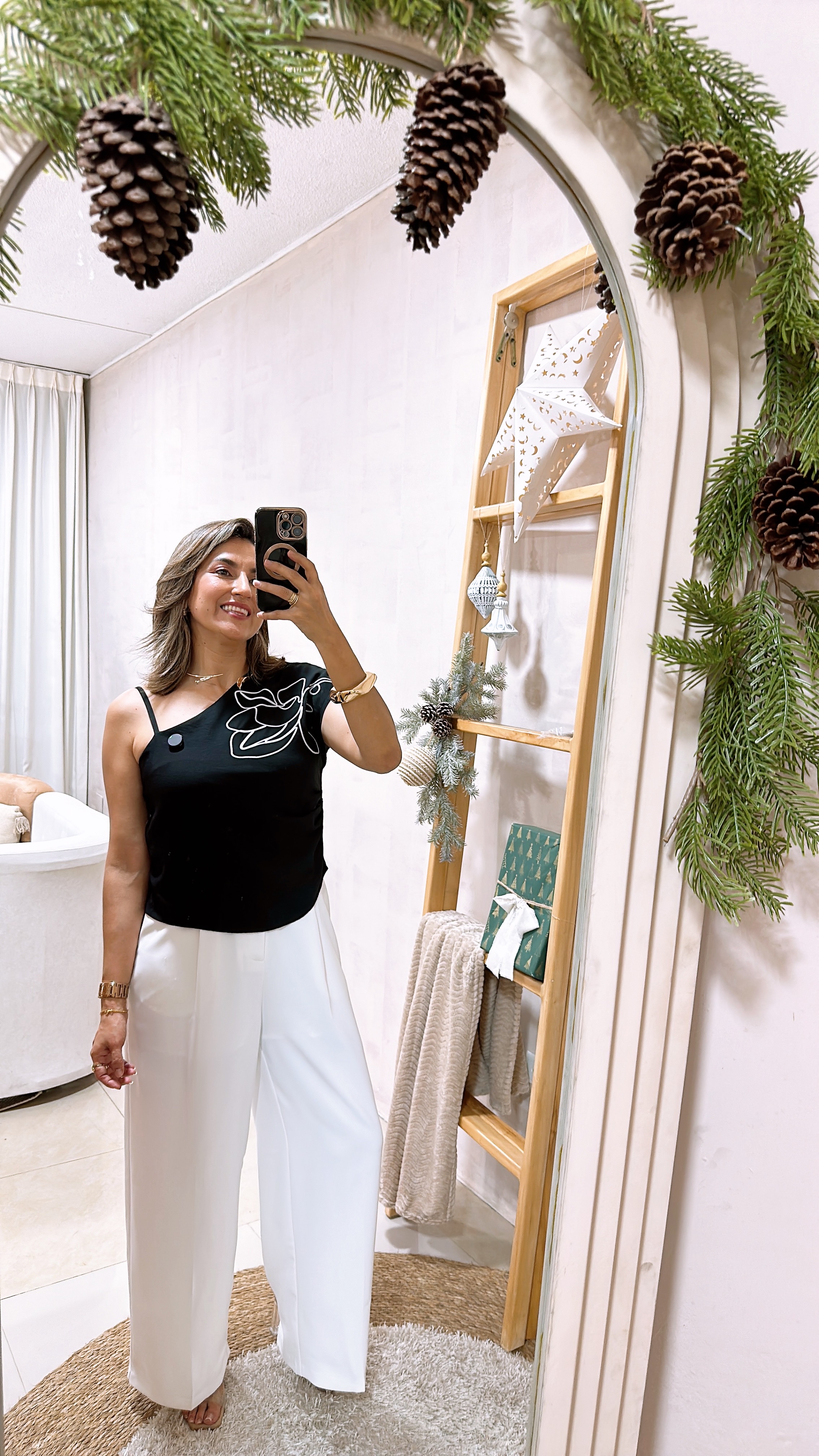 Pantalón basta recta con pinzas y bolsillos funcionales - Blanco, S+Blusa de un hombro con estampado de flor - Negro, flor blanca, S+Pulsera Dorada de mujer