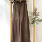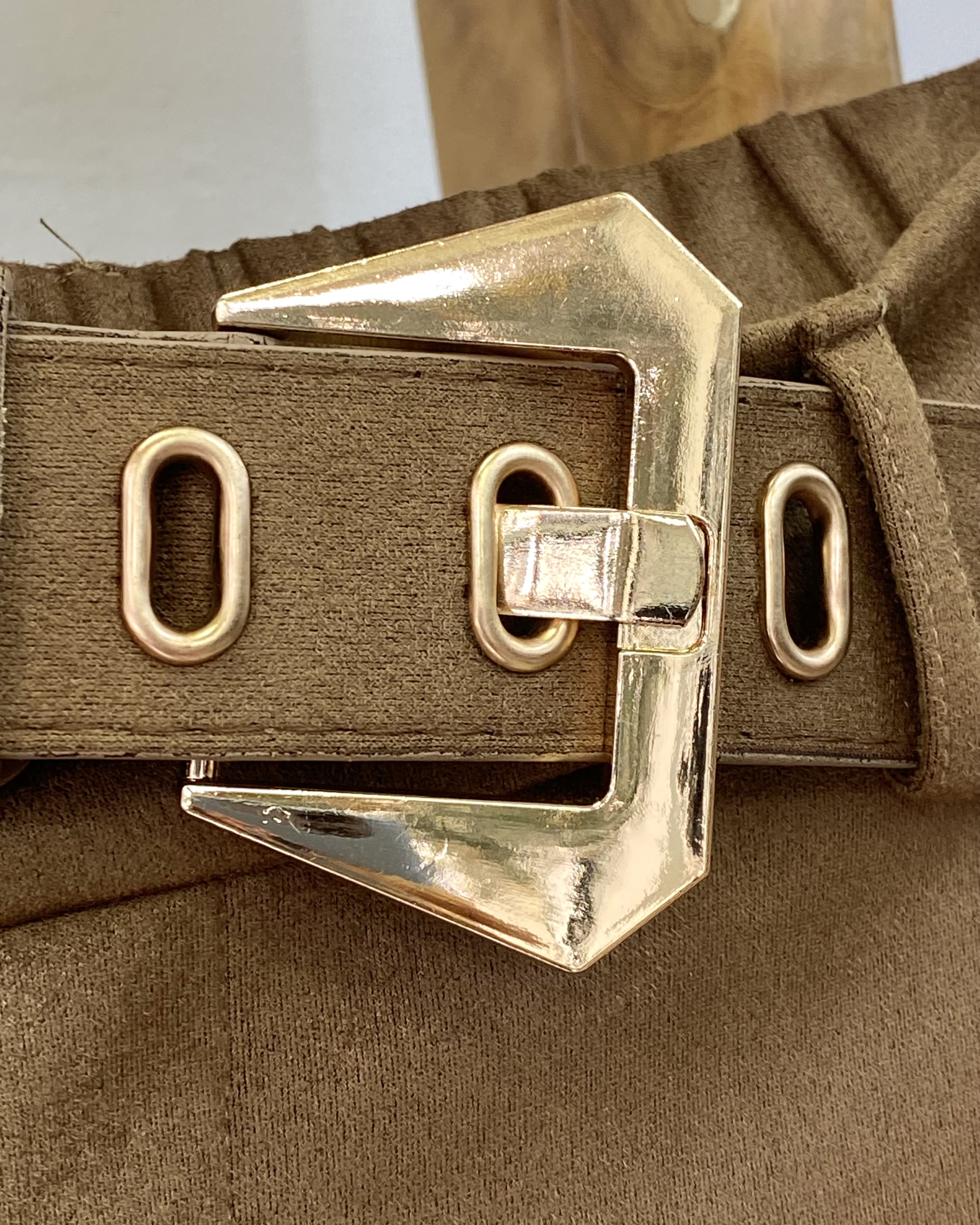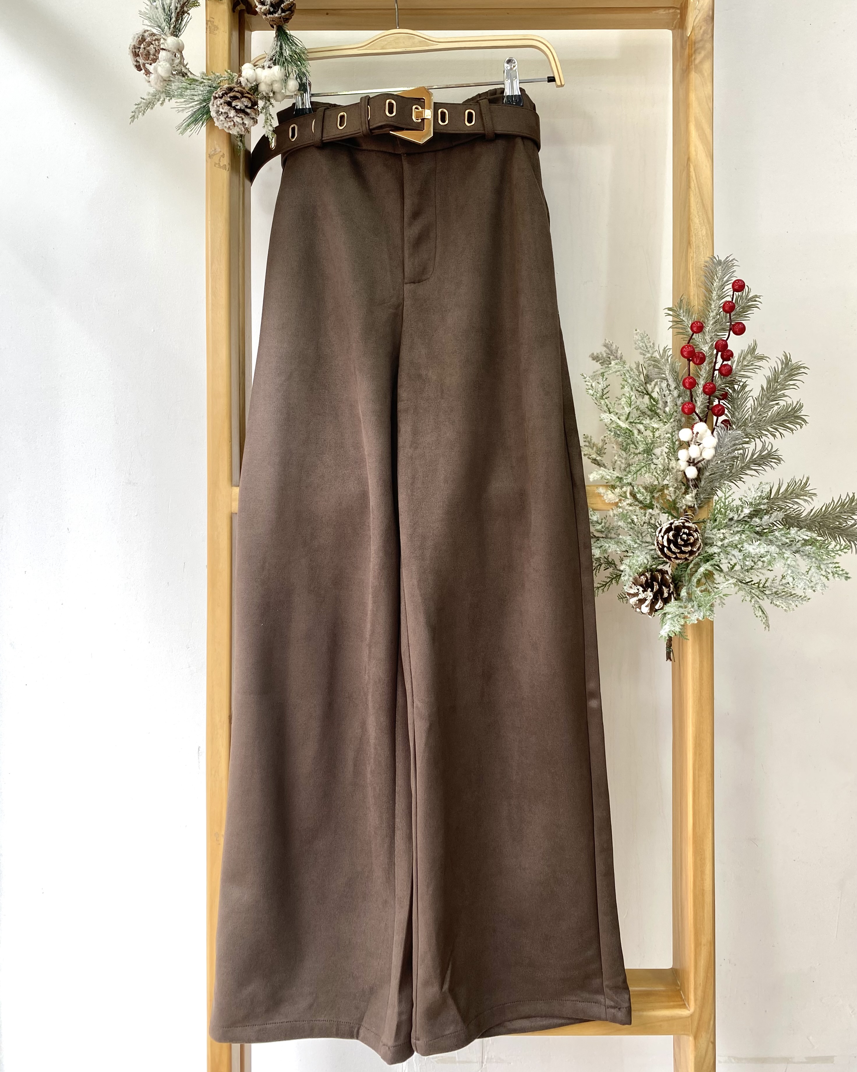 Pantalón basta recta con elástico en pretina, efecto gamuza incluye cinturón.