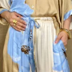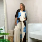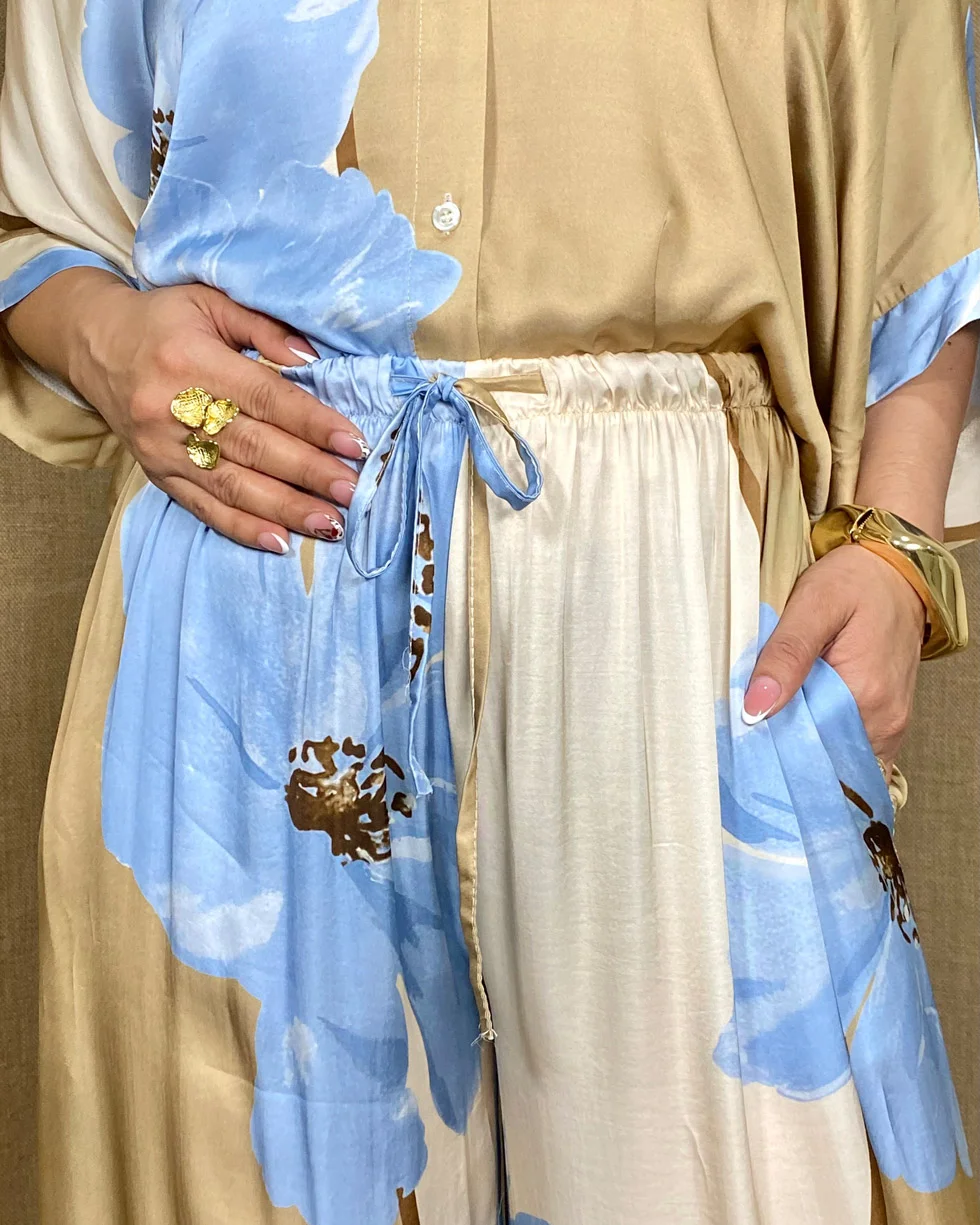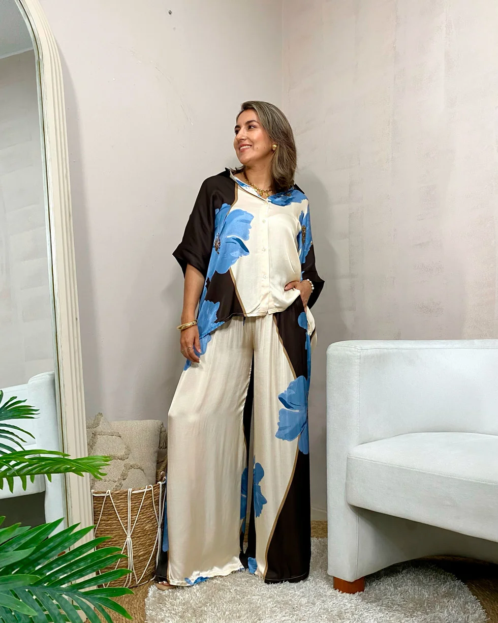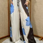Este pantalón en tela satinada con un diseño de pierna ancha y tiro alto. La pierna izquierda y la parte trasera de la pierna derecha son de tonos llanos, mientras que la pierna derecha y la parte trasera de la pierna izquierda presentan un estampado floral de grandes flores azules. El pantalón tiene una cintura elástica con un cordón ajustable y bolsillos laterales.