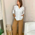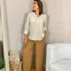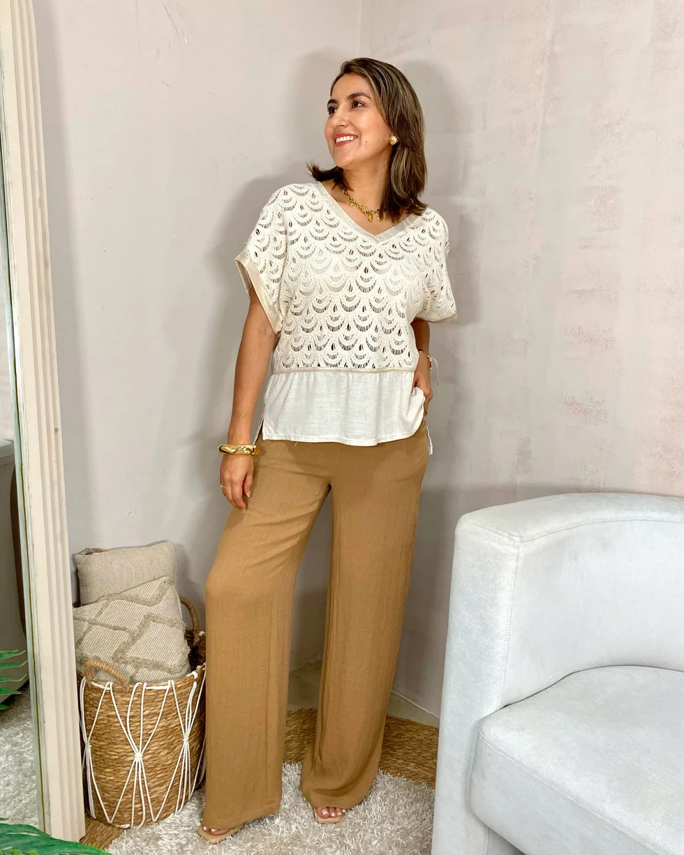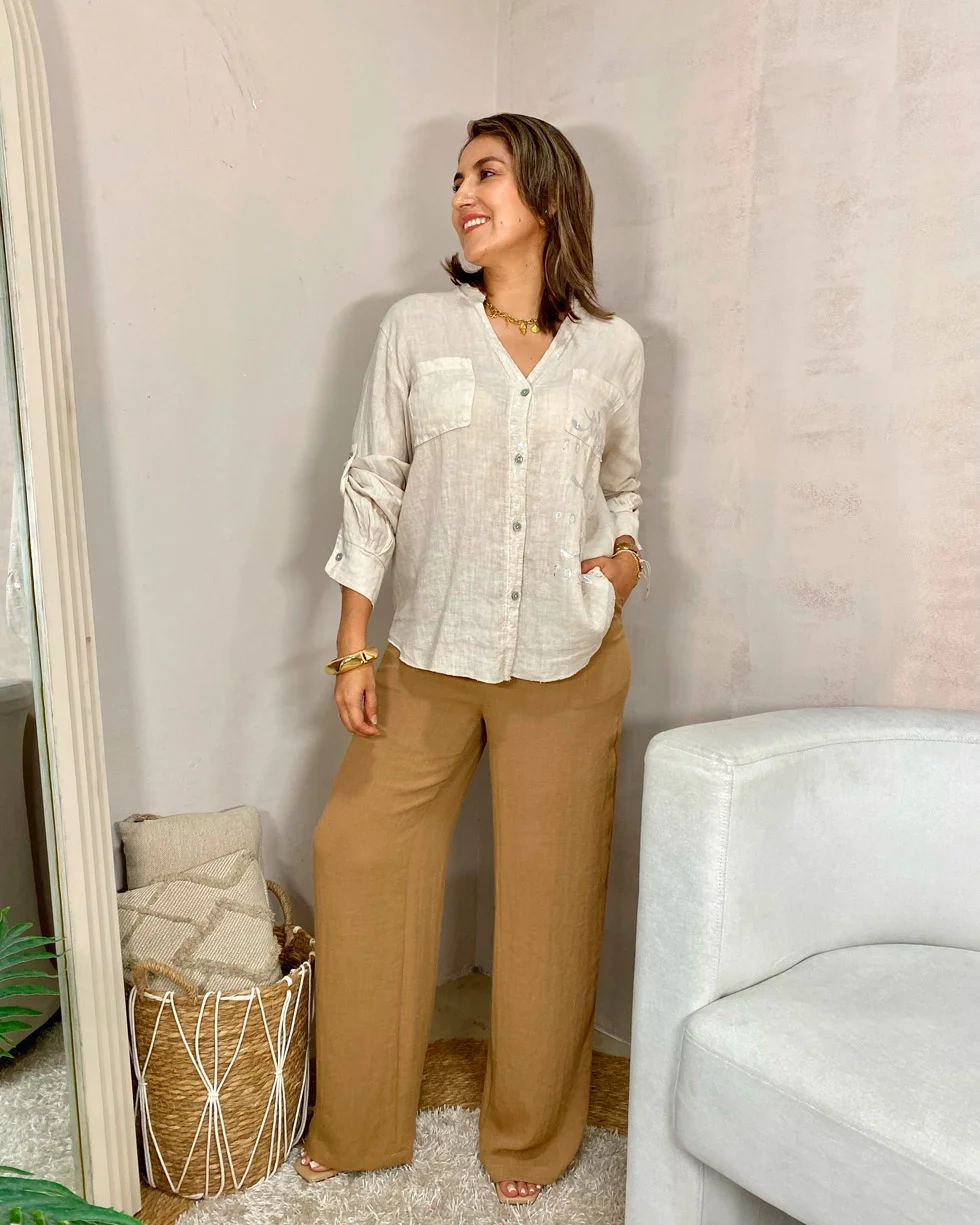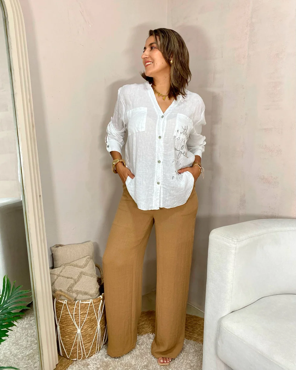 Pantalón palazzo color camel de lino, fresco y elegante.