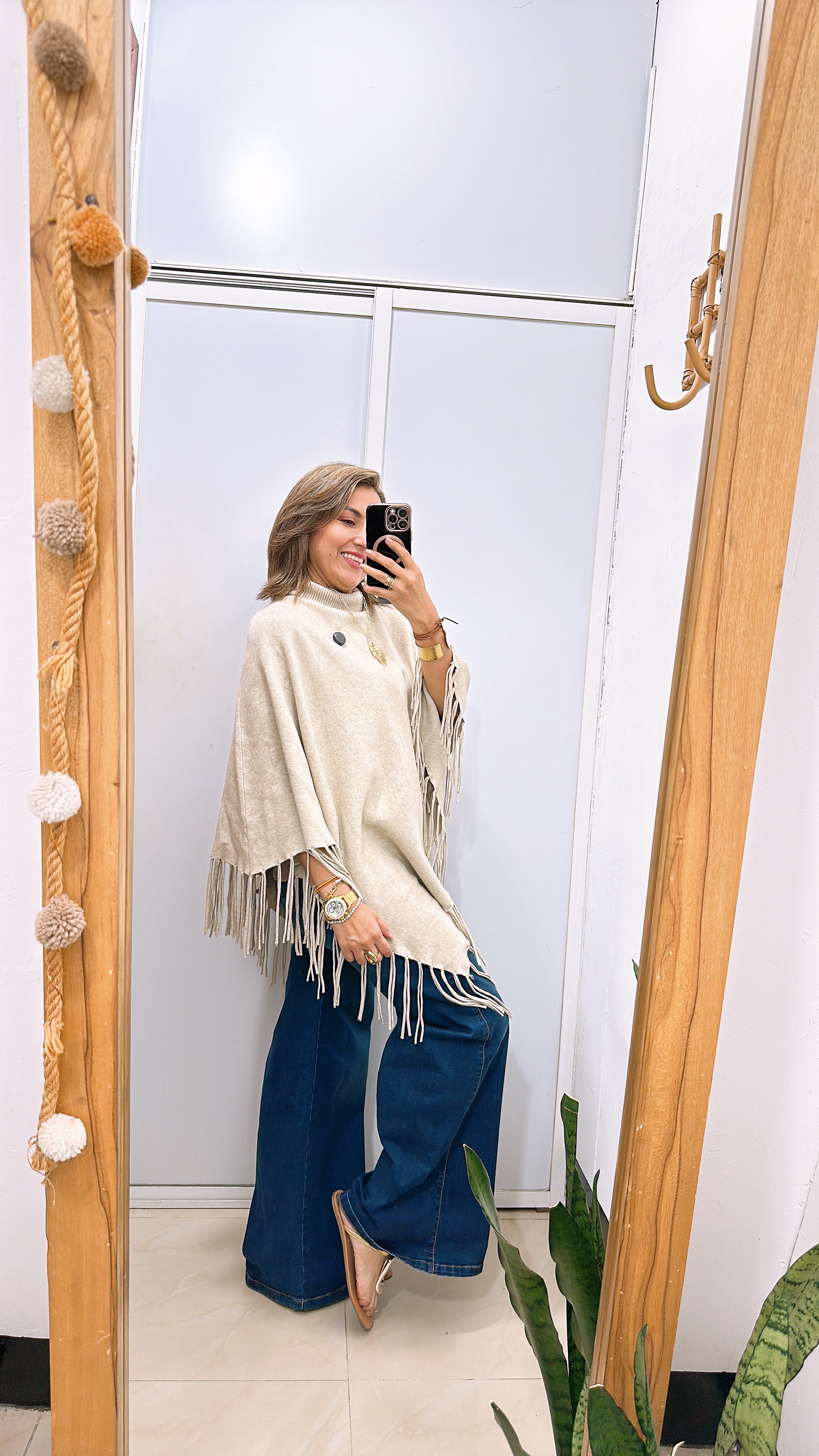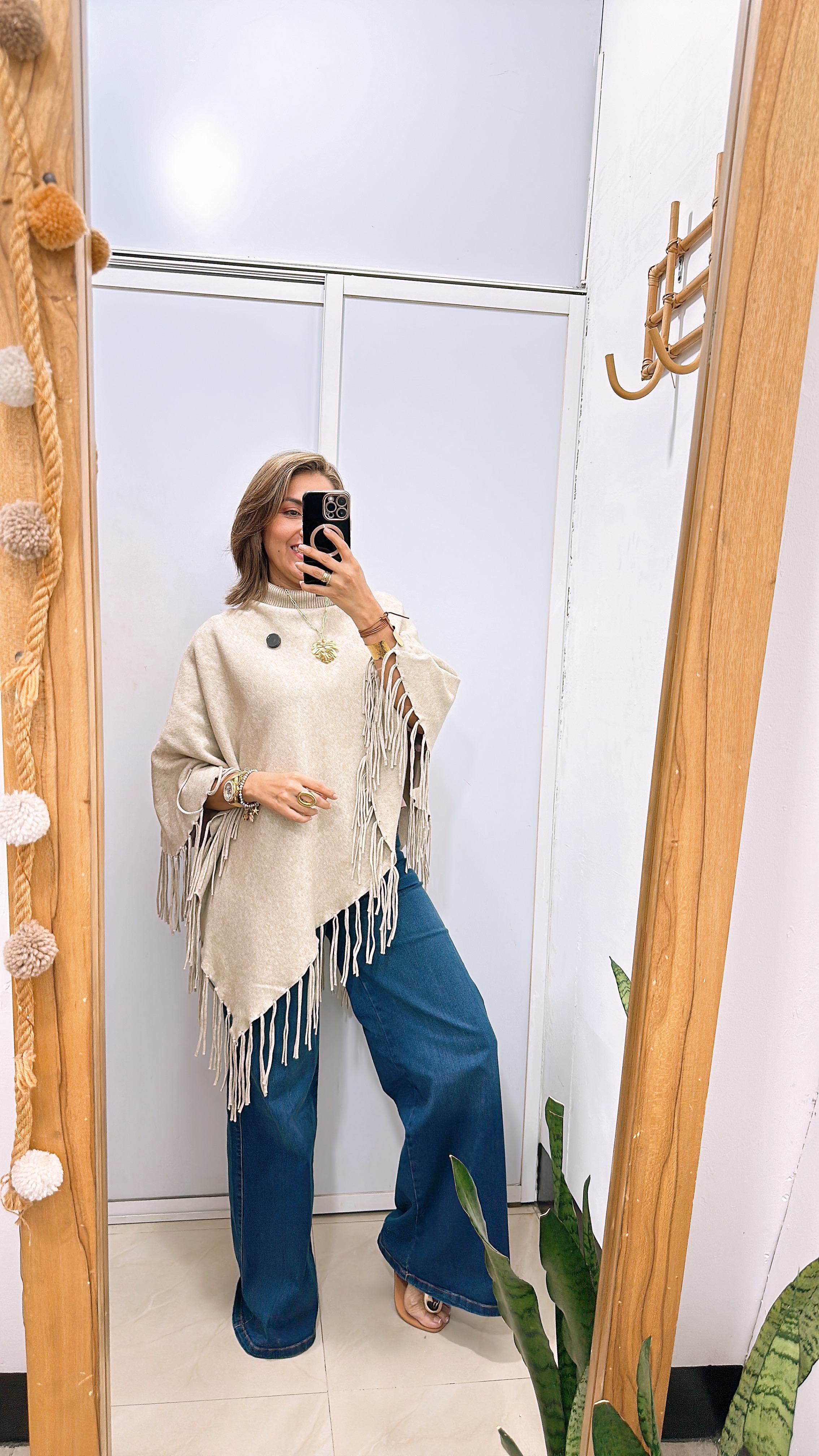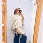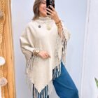 - Poncho cuello tortuga con flecos en cenefa