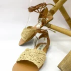 Este modelo de sandalias está confeccionado en tono camel, cuentan con una franja frontal en yute tejido con delicados detalles en espiral y tiras finas que se ajustan al tobillo para mayor seguridad. Son ideales para looks de primavera-verano. Además, su diseño ligero y natural combina fácilmente con vestidos, faldas, shorts o pantalones frescos.