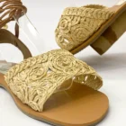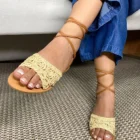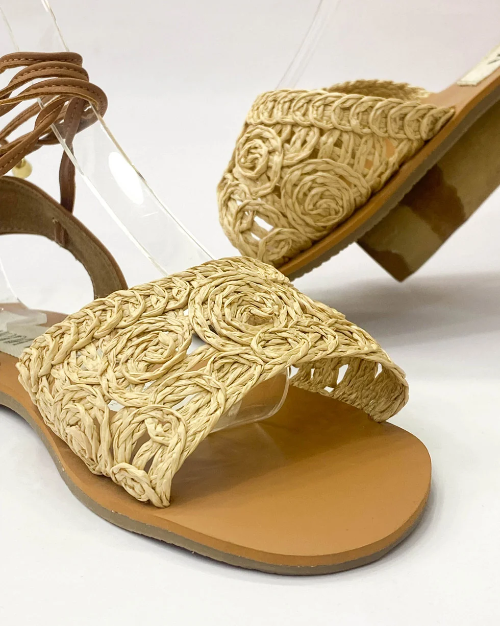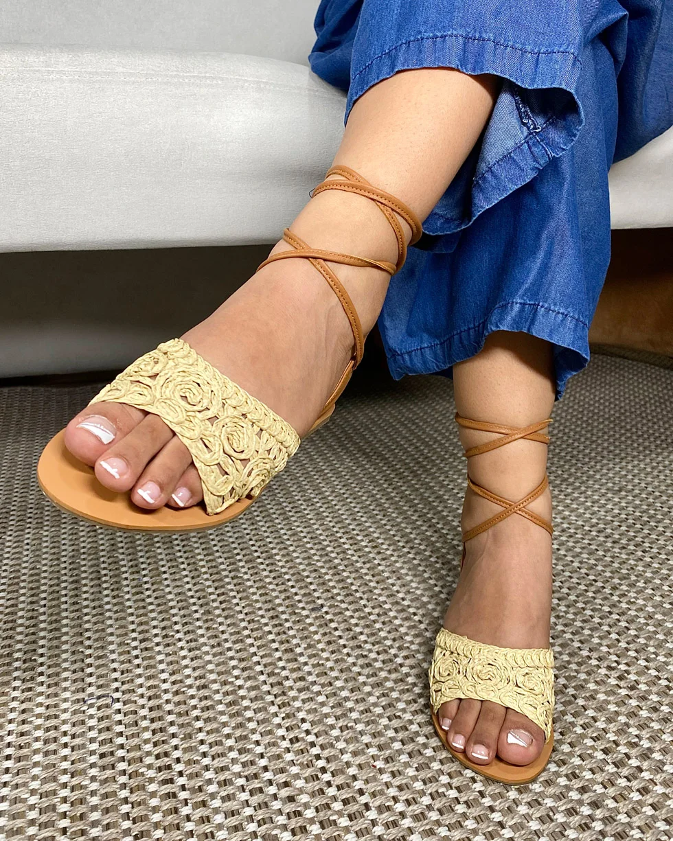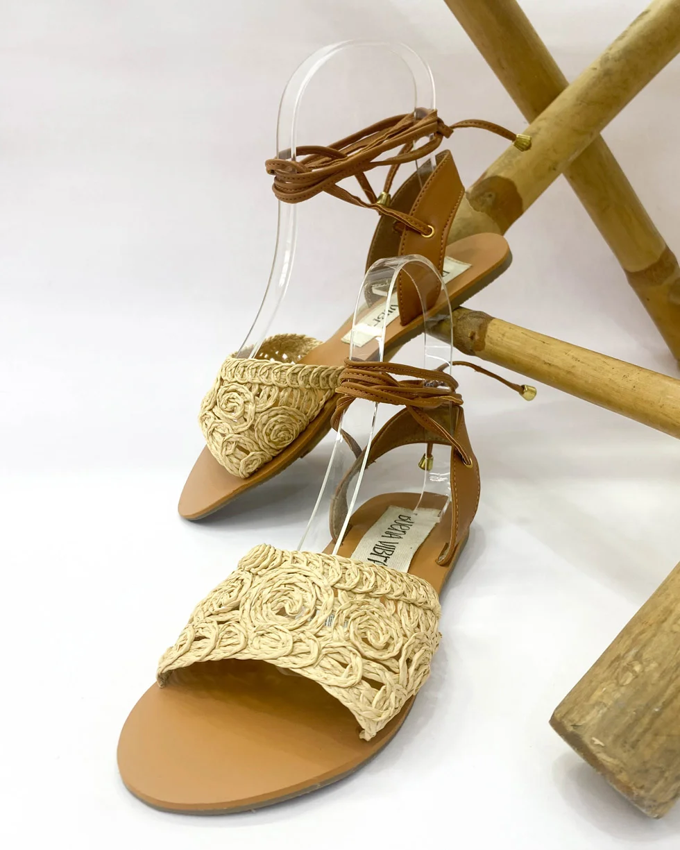 Sandalias planas en tono camel con diseño artesanal de yute tejido y amarre al tobillo.
