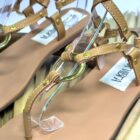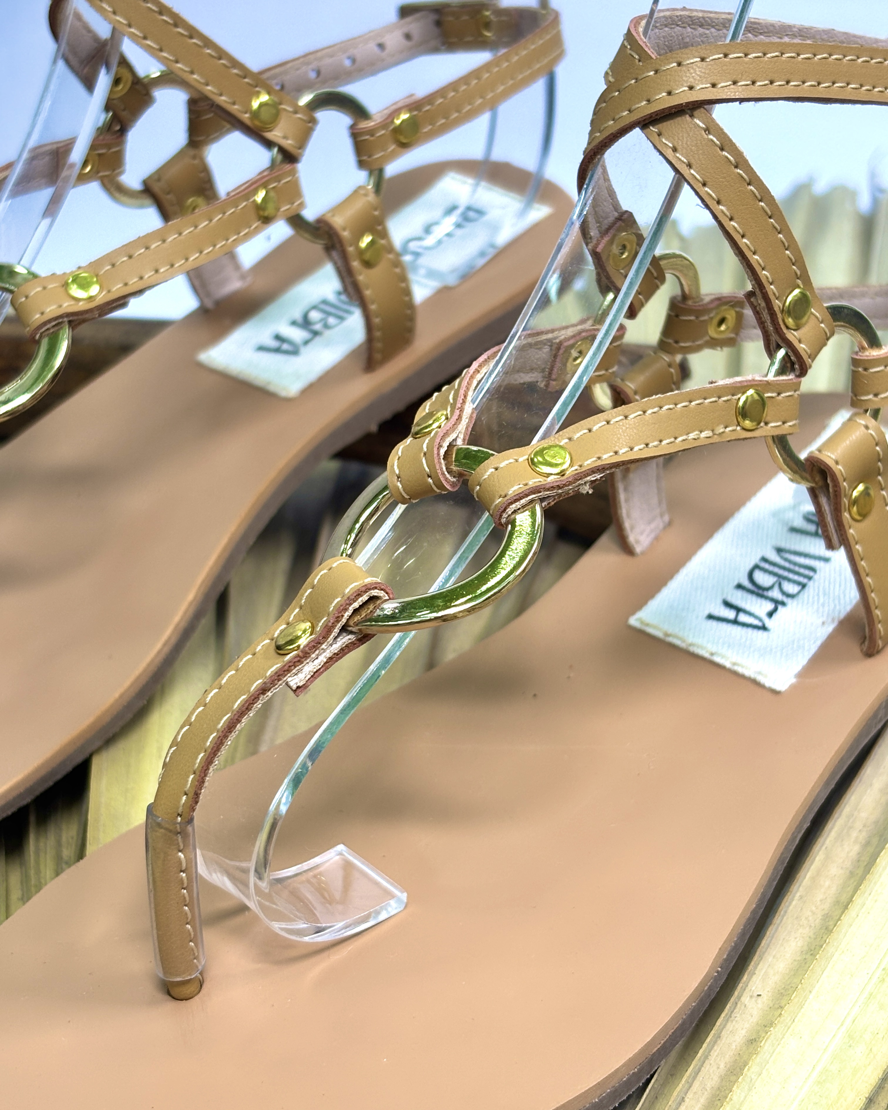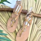Sandalias planas con tiras finas y detalle dorado, ideales para un look fresco.