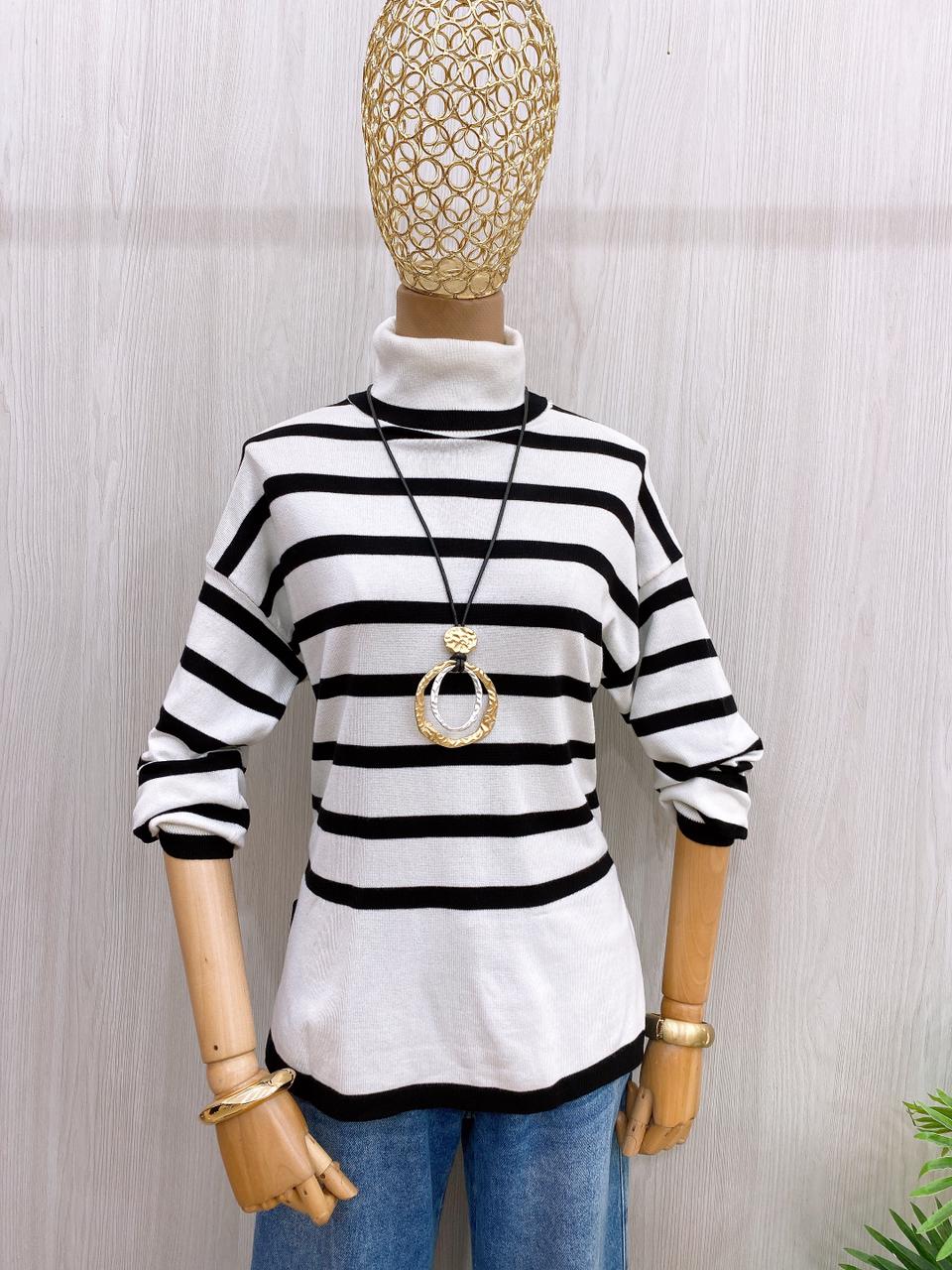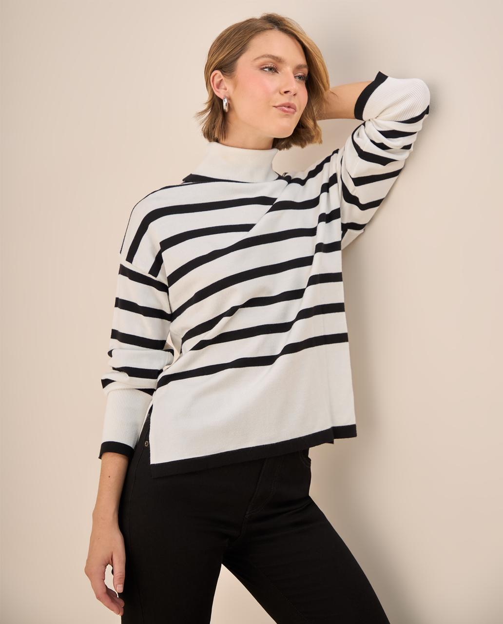 Saquito a rayas negro con blanco con cuello tortuga.