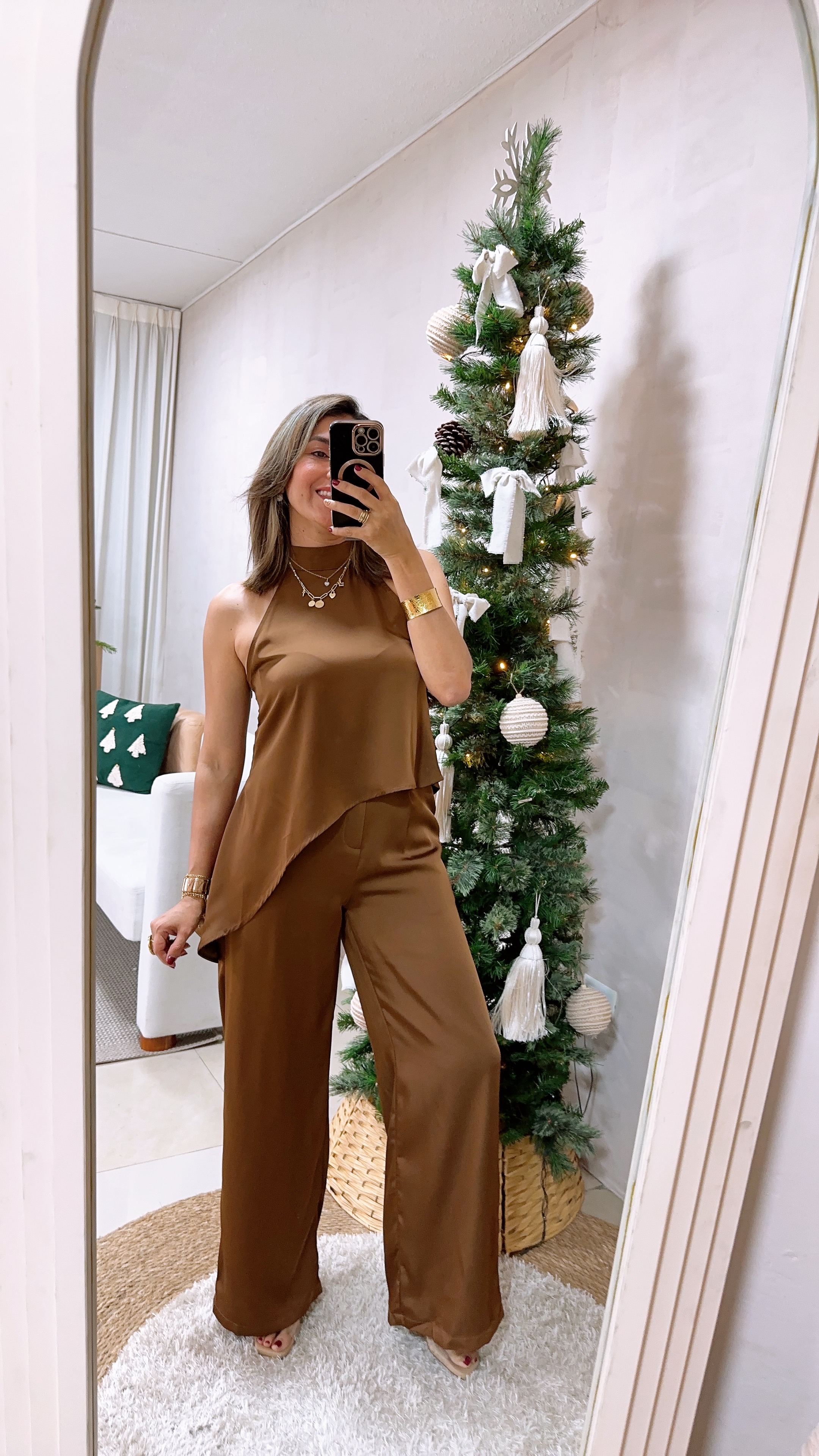 Set 2 piezas textura satinada, blusa asimétrica cuello halter y cierre lateral. Pantalón palazzo con bolsillos funcionales e incluye cinturón.