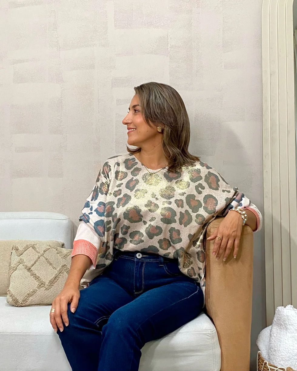 - Sweater animal print con detalles doradosMedidas Modelo: Busto: 96cm Cintura: 76cm Cadera: 103cm
