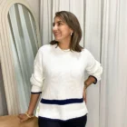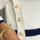 Suéter tejido tono crudo con franjas azul marino y botones laterales decorativos.