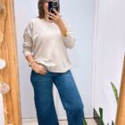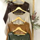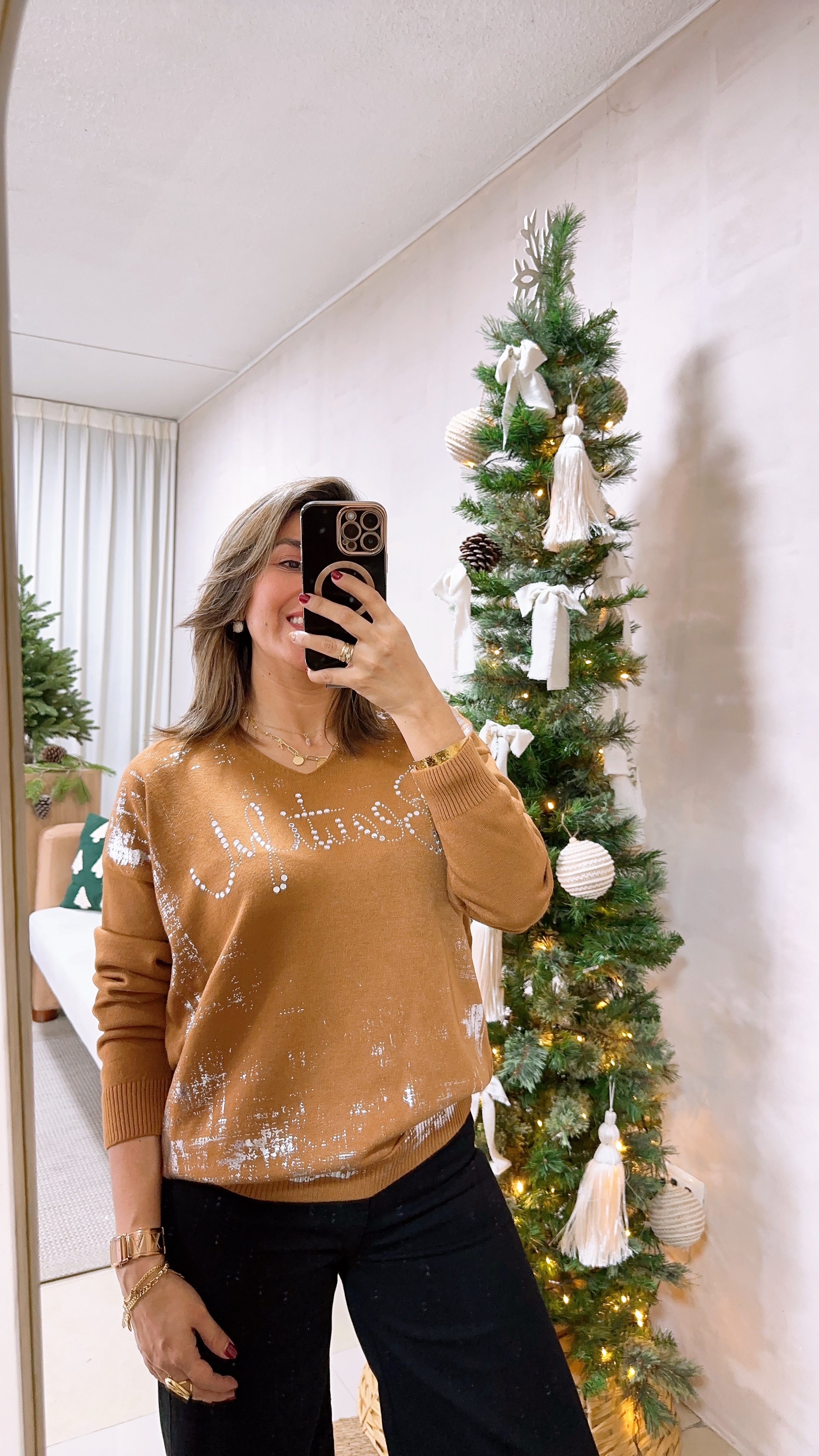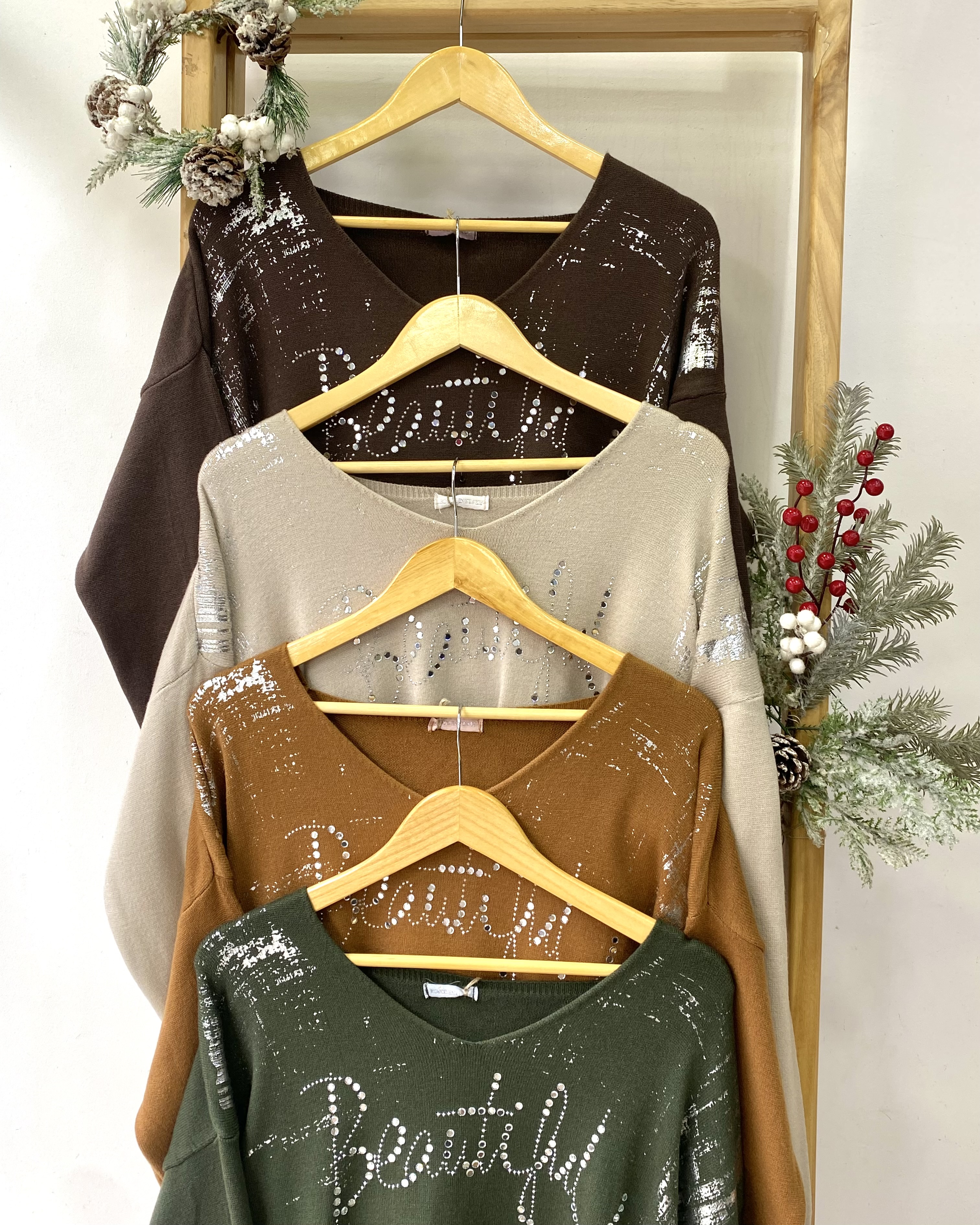 Sweater cuello en V con pedrería en frente y foil plateado.