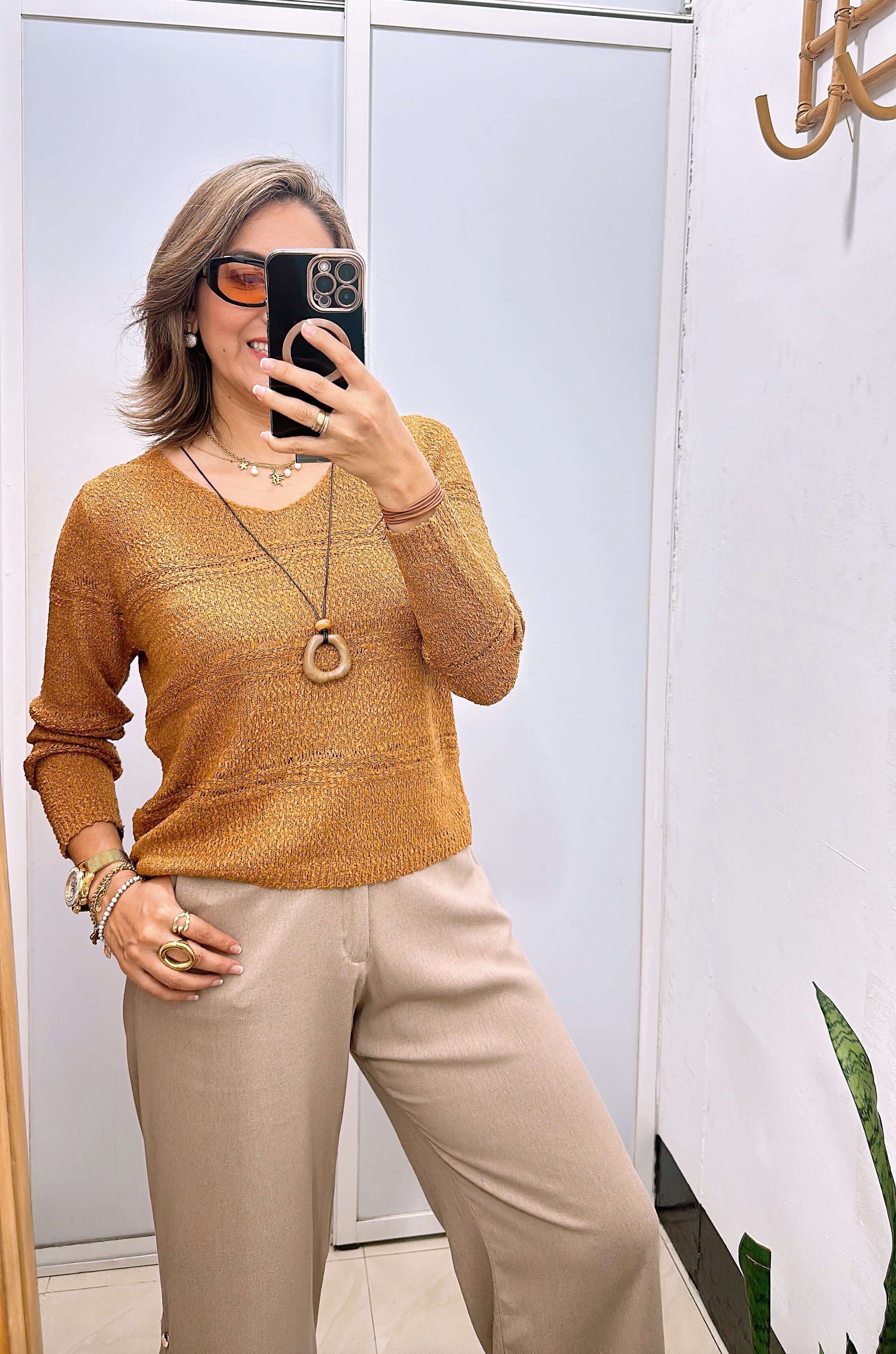 Sweater cuello en V incluye collar - Única, Beige tejido collar+Palazzo de tiro alto y corte amplio, incluye cinturón - S, Camel apagado