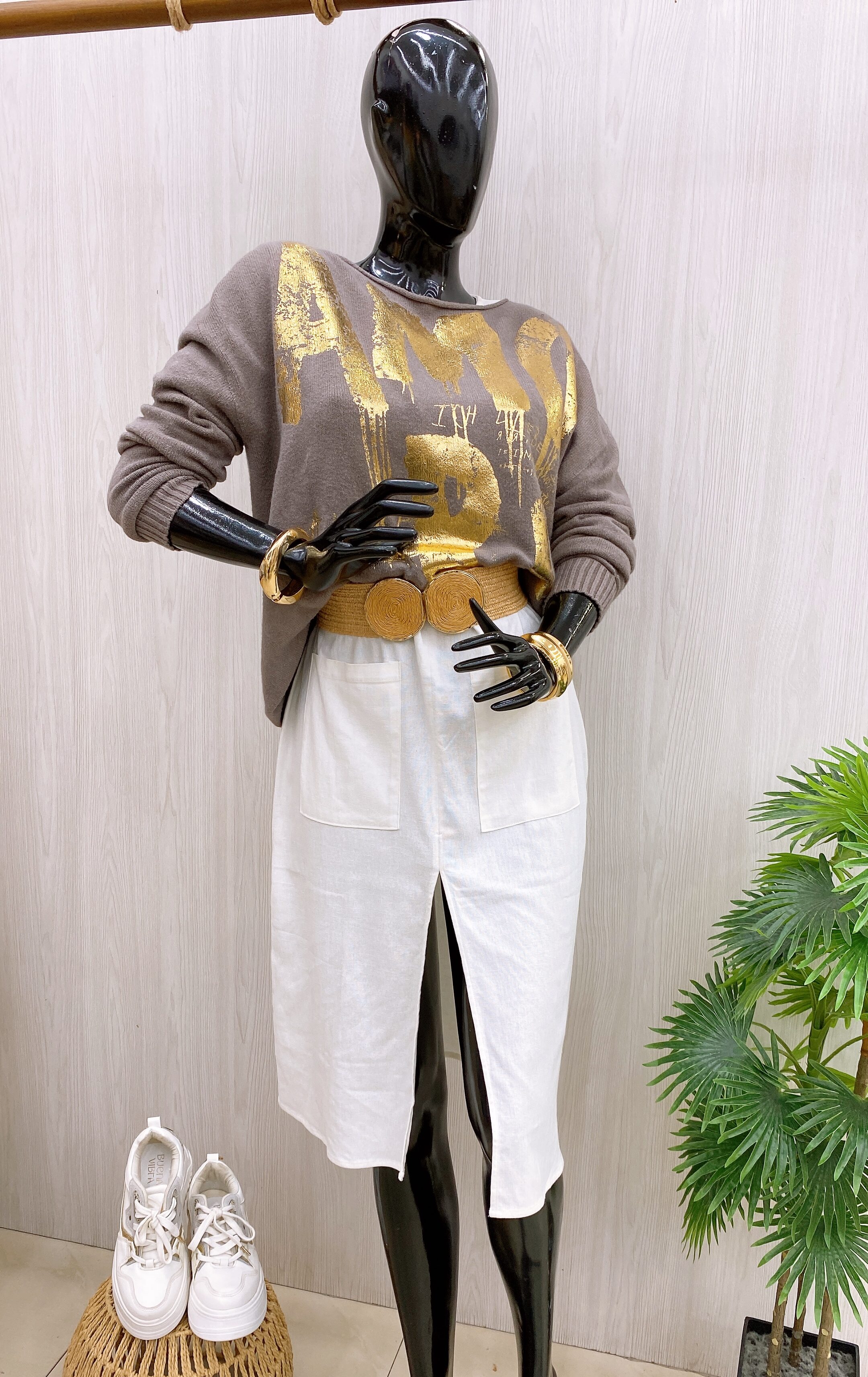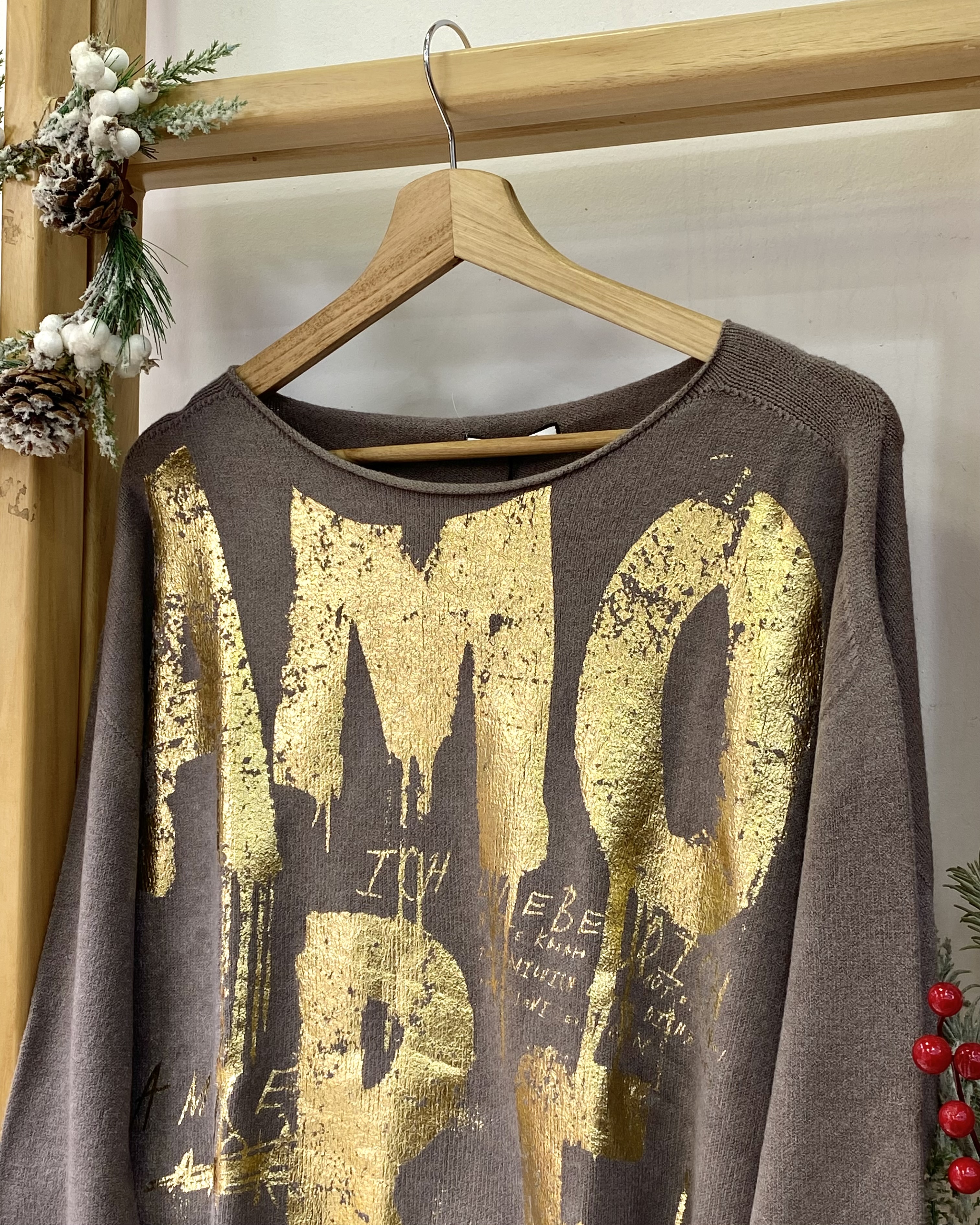 Sweater cuello redondo con letras estampadas en foil dorado en la parte frontal.