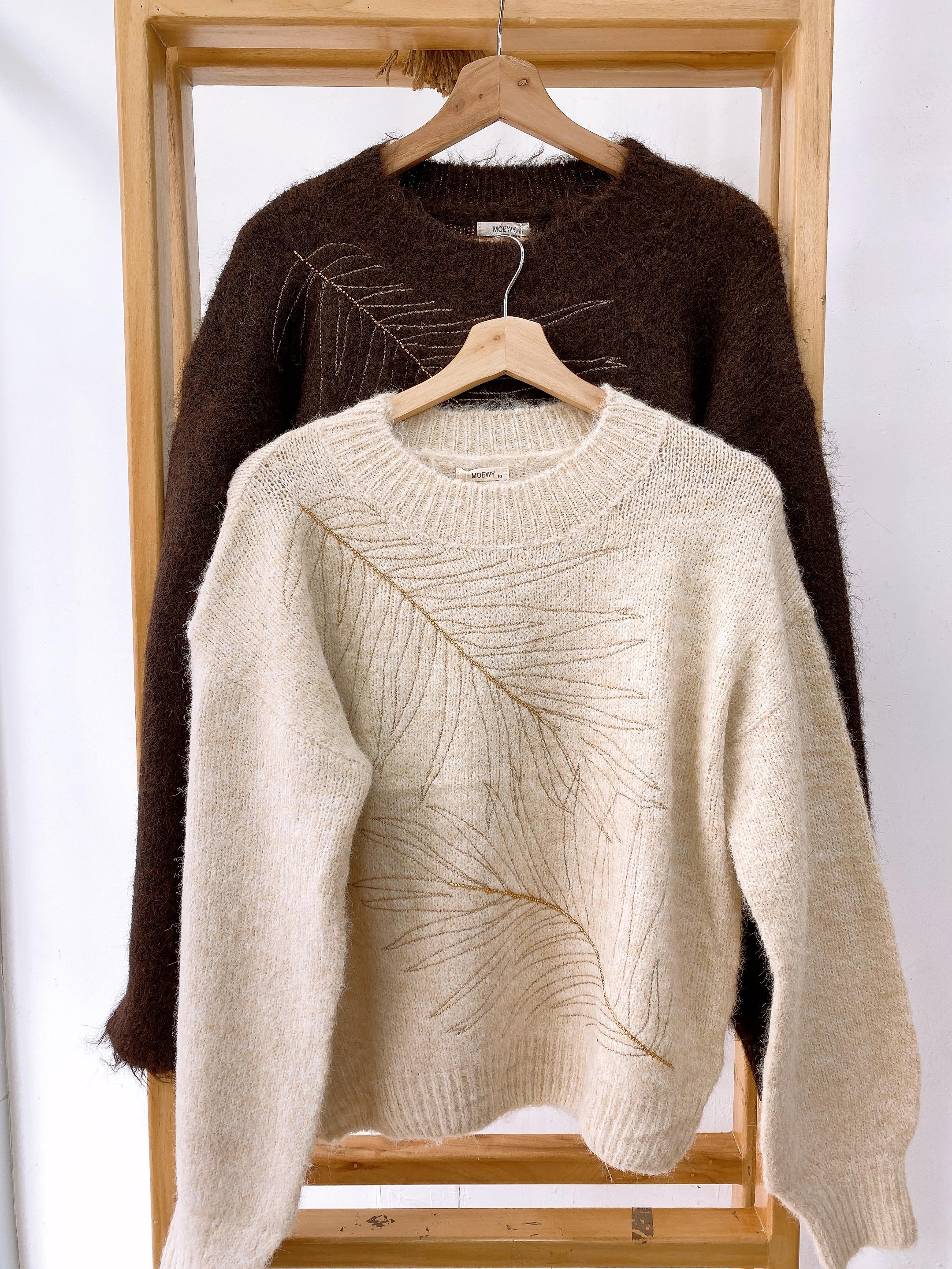 Sweater tejido cuello redondo con bordado hojas