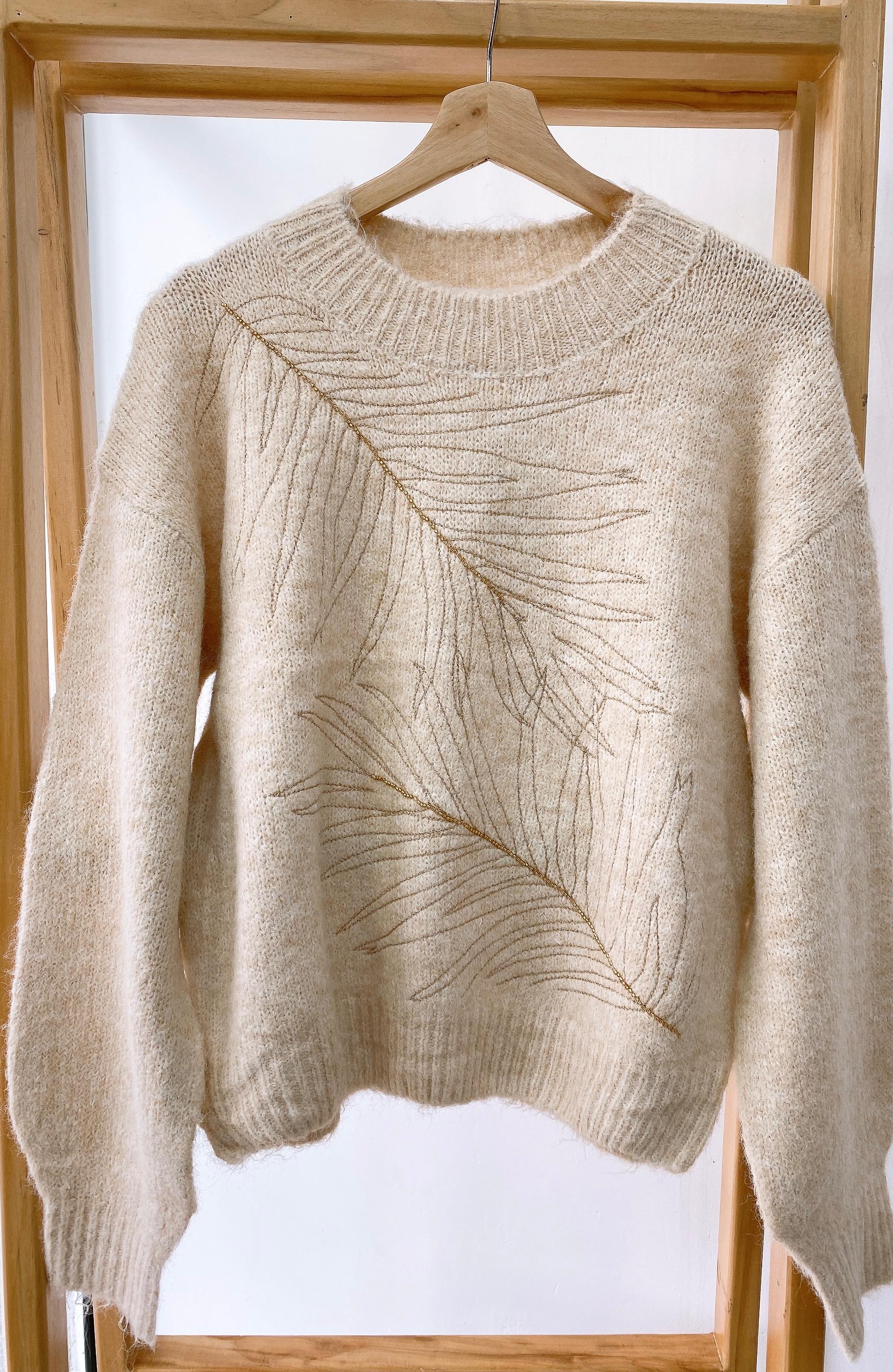 Sweater tejido, cuello redondo con detalle de hoja bordada con hilo dorado y detalle de mullo