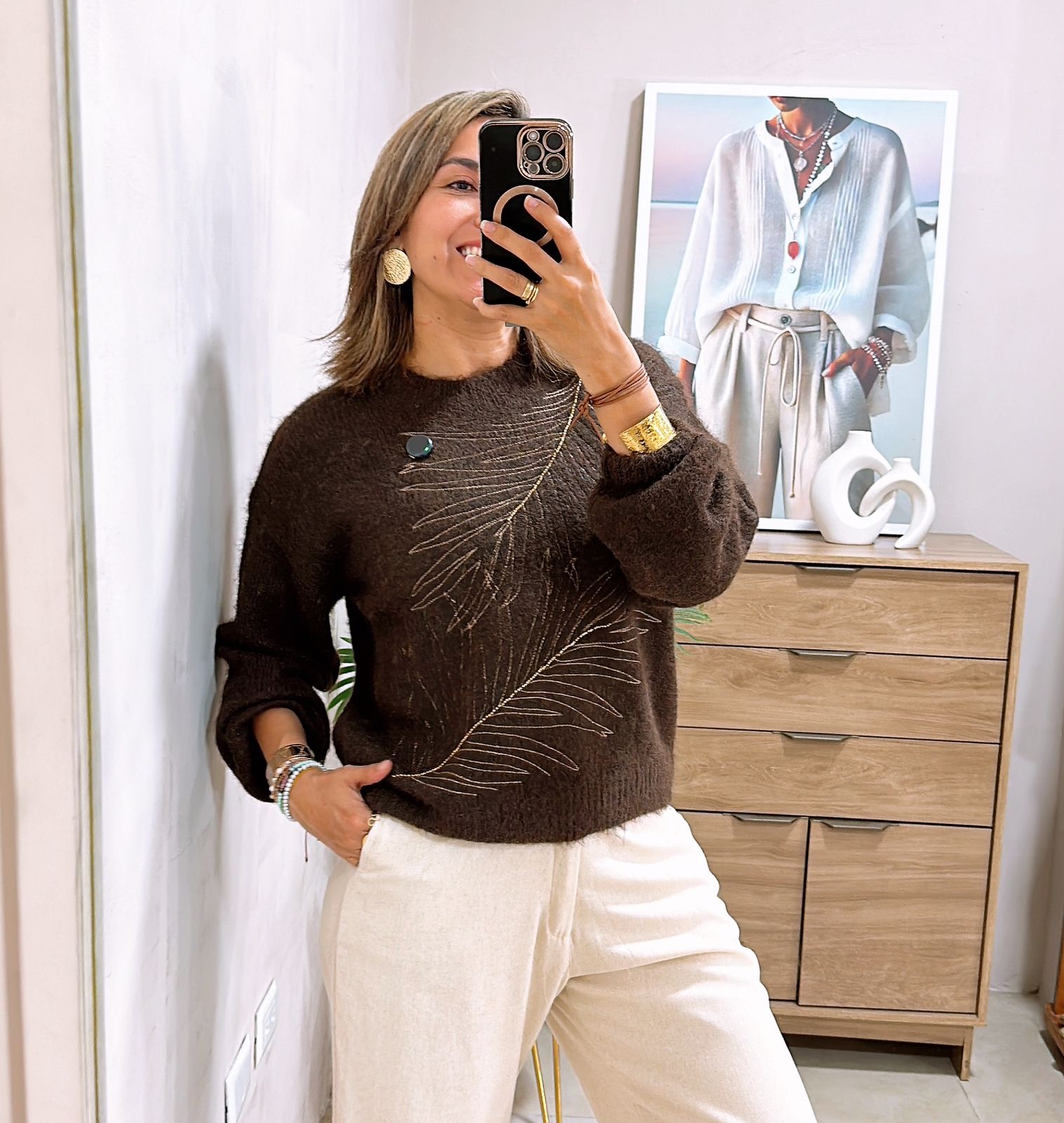 Sweater tejido cuello redondo con bordado hojas - Única, Beige tejido mullo dorado+Palazzo de tiro alto y corte amplio, incluye cinturón - S, Camel apagado