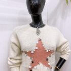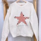 Sweater tejido de cuello redondo con detalle de estrella en frente decorada con perlas y lentejuelas.