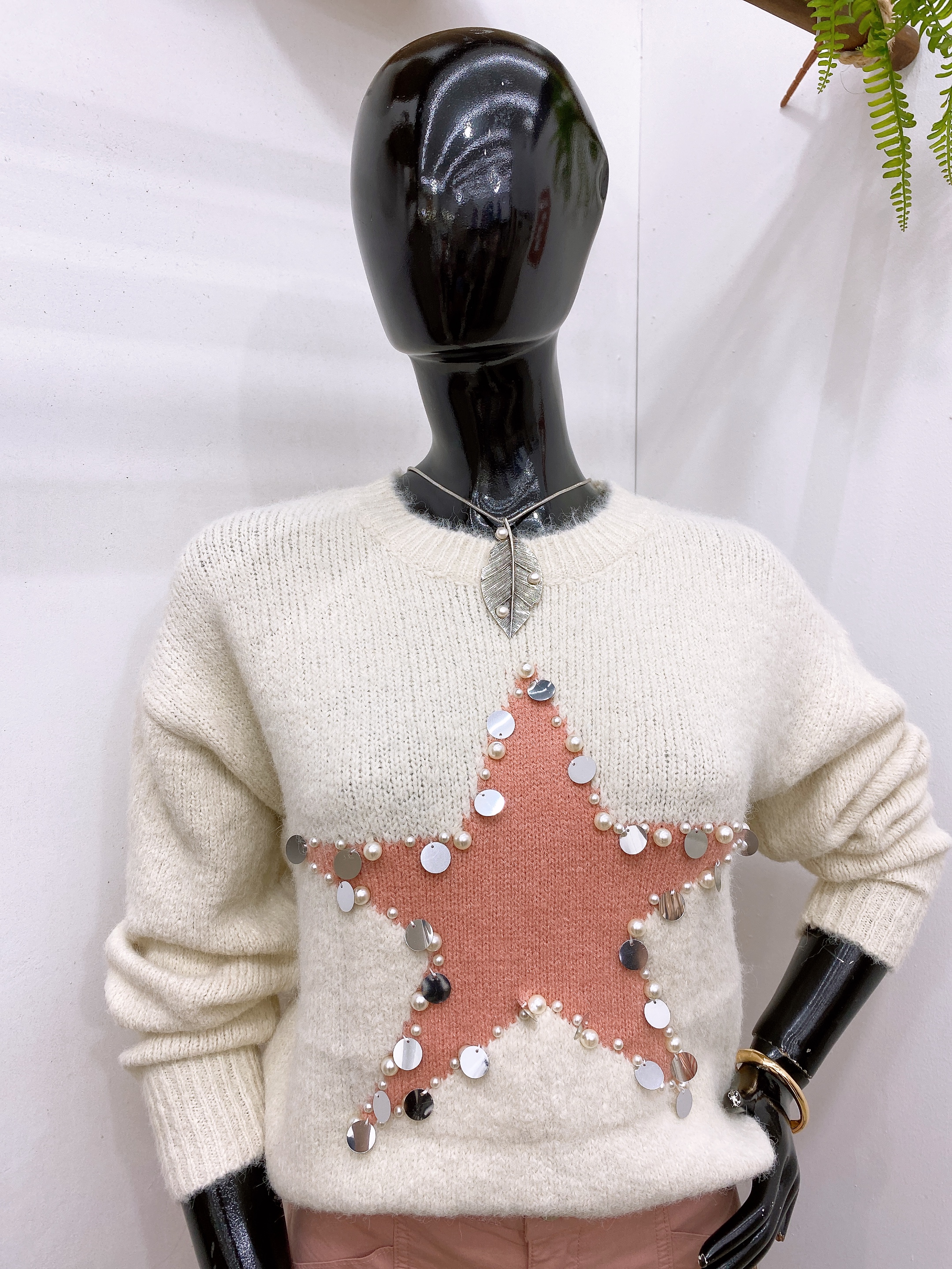Sweater tejido de cuello redondo con detalle de estrella en frente decorada con perlas y lentejuelas.