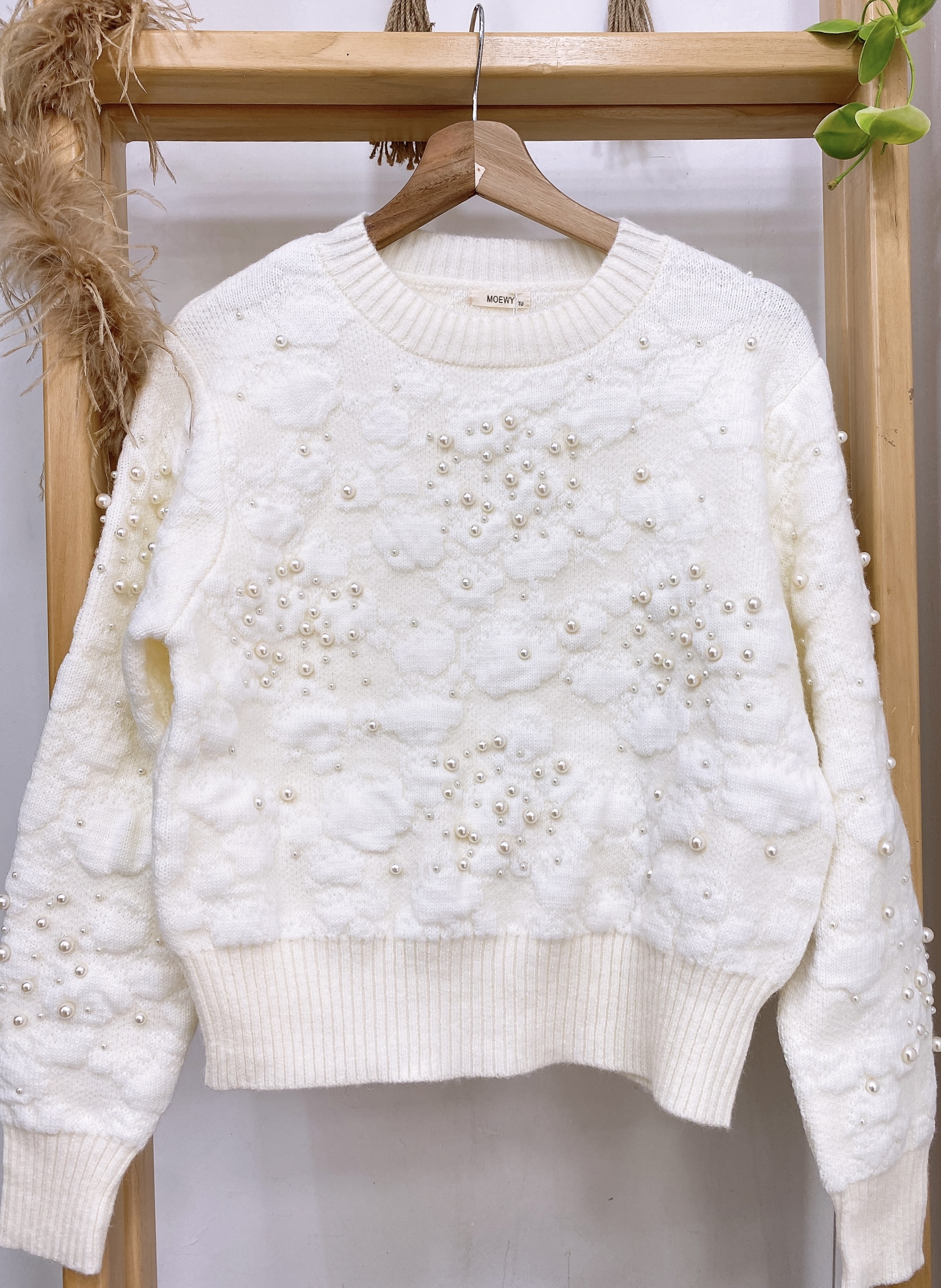Sweater tejido de cuello redondo con detalle de perlas en mangas y frente de la prenda.