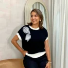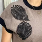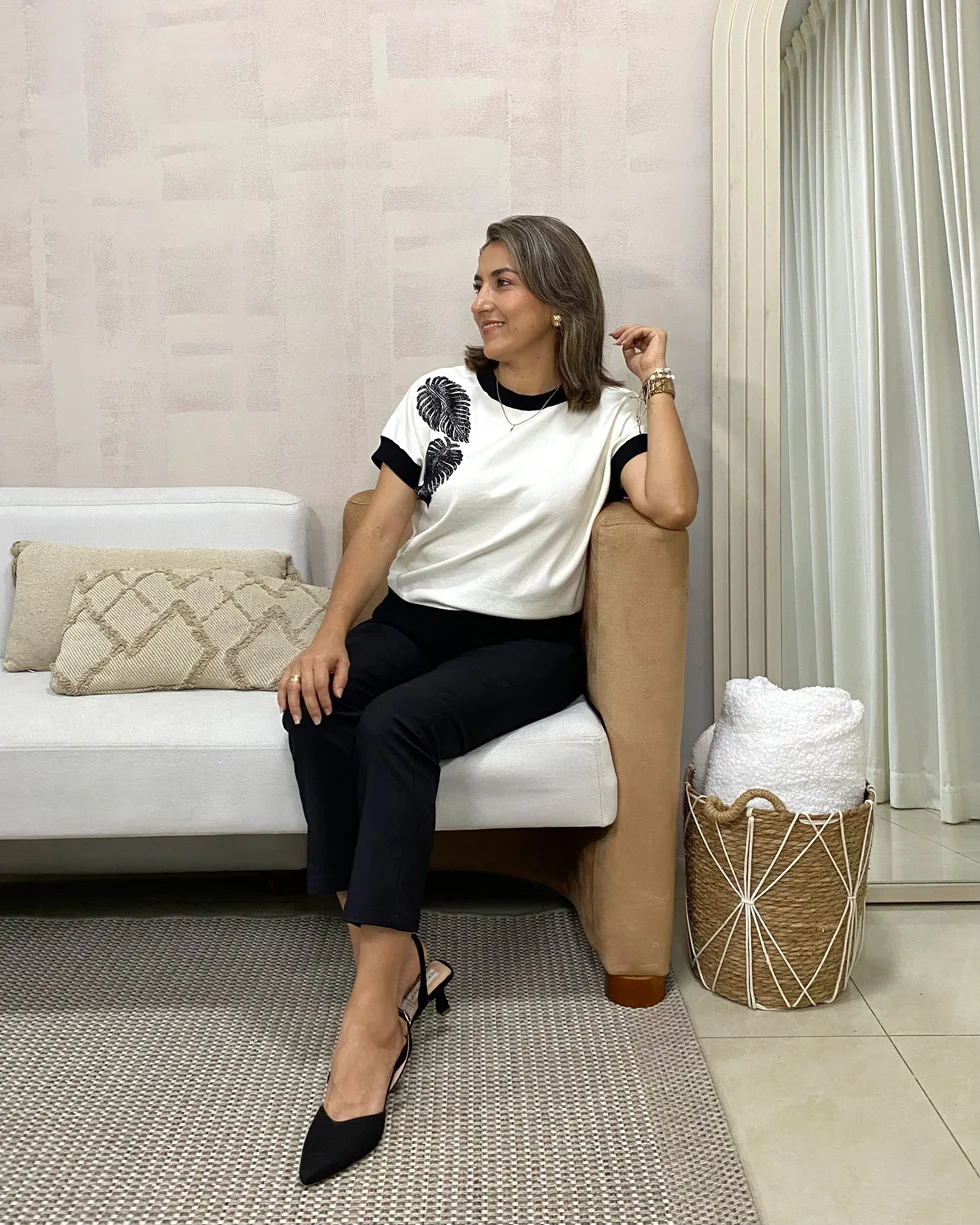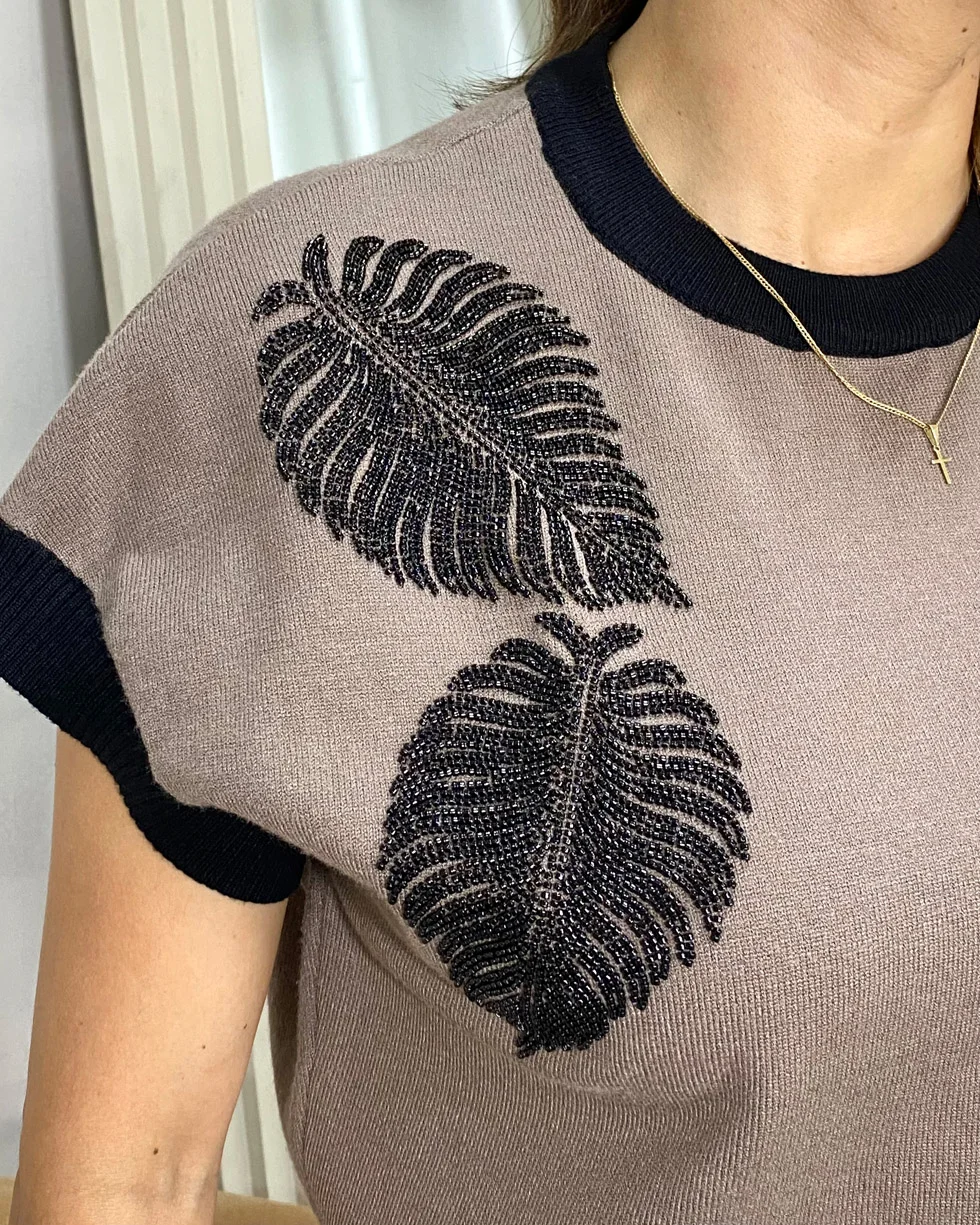 Esta es una blusa estilo suéter color negro de manga sisa. Su bordado de hojas en mullos de tono blanco le aportan un toque sofisticado, mientras que los ribetes en tono beige en cuello, mangas y basta añaden un aire contemporáneo. Esta prenda es perfecta para combinar con pantalones formales o jeans, es ideal tanto para el día como para la noche.