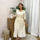 Vestido camisero beige con bordados, cinturón ajustable y falda con volante, elegante y versátil.