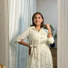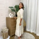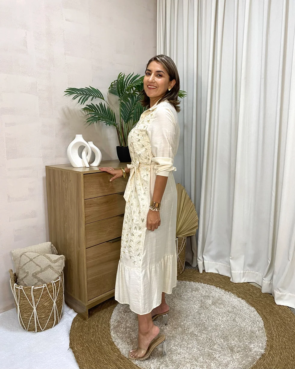 Este vestido camisero en tono beige es la combinación perfecta entre elegancia y frescura. Su diseño destaca por los delicados bordados frontales de lentejuelas doradas, botones centrales y una falda con un ligero vuelo que le aporta movimiento. También incluye un cinto ajustable que realza la figura de manera sutil y favorecedora. Ideal para reuniones de día o eventos casuales. Su confección en tela ligera lo hace una opción cómoda y fresca para cualquier temporada.