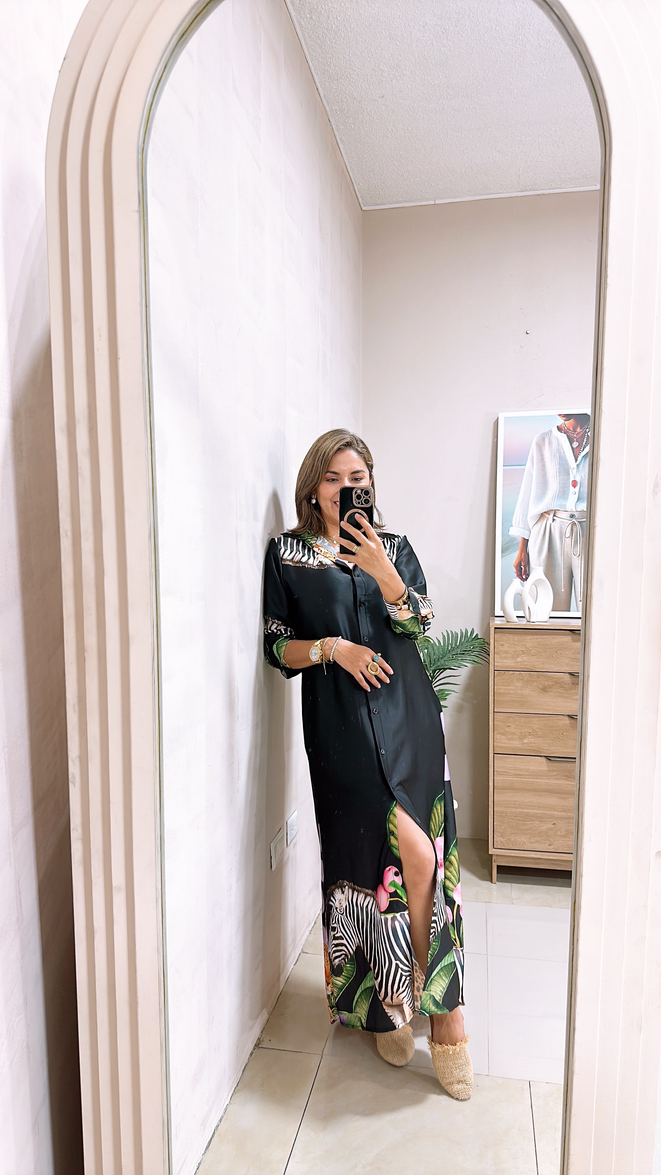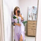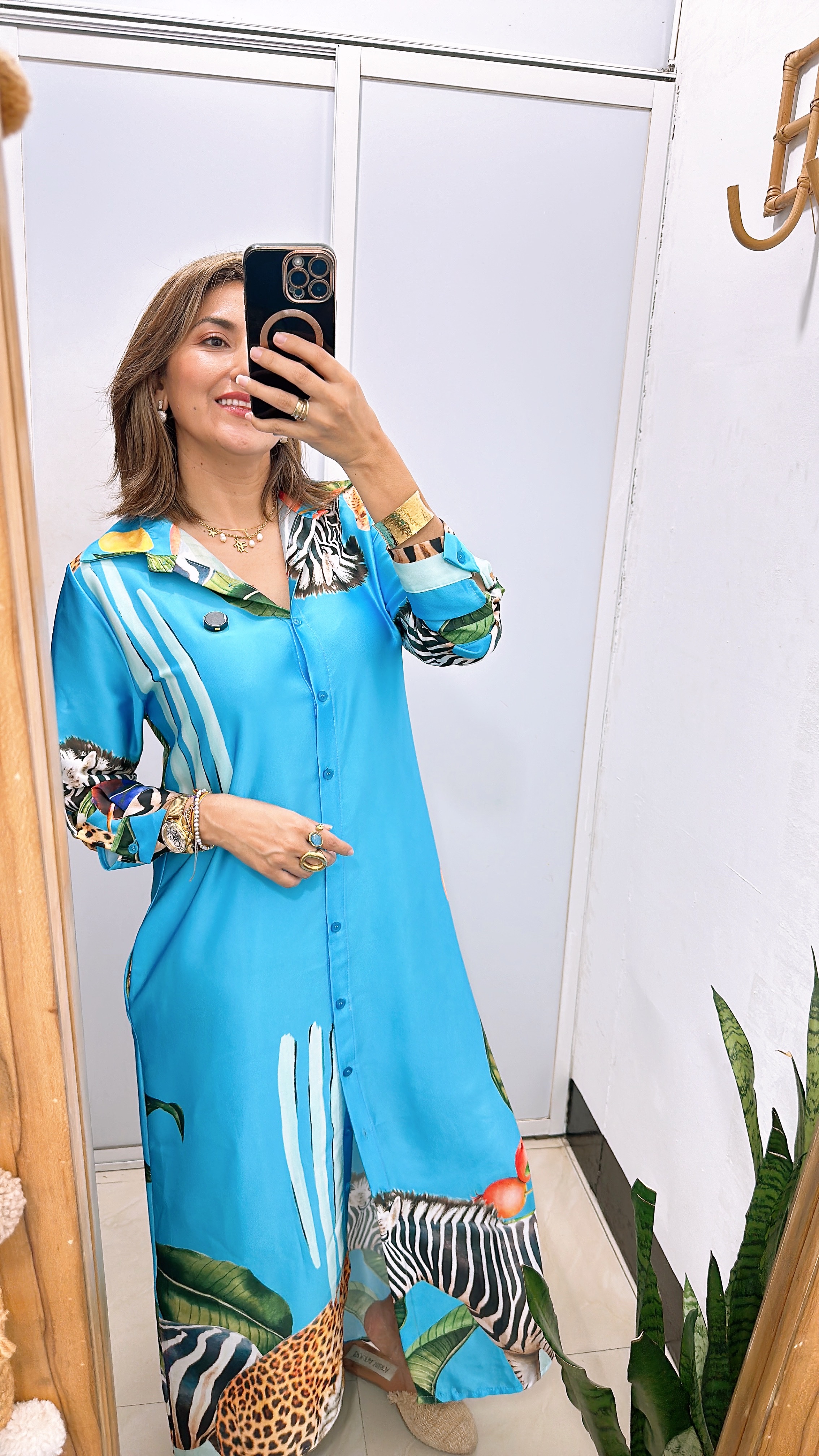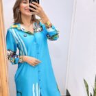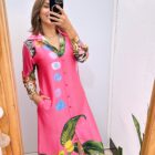 Vestido camisero manga larga con bolsillos funcionales y estampados print en tonos vibrantes.