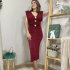 Esta vestido de corte midi es una prenda que te permite realzar la silueta con elegancia. Presenta un escote en V y un fruncido frontal que es favorecedor para moldear la cintura. Cuenta con botones decorativos dorados, de acabado texturizado. Lo podemos combinar con accesorios dorados y un calzado elegante para resaltar tu outfit.