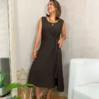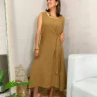 El vestido es un modelo, sin mangas, con cuello redondo y un diseño cruzado en la parte delantera que ajusta en la cintura. La falda de corte largo y en A tiene una caída suelta. Está confeccionado en tejido de lino lo que le da una apariencia fresca y natural.