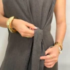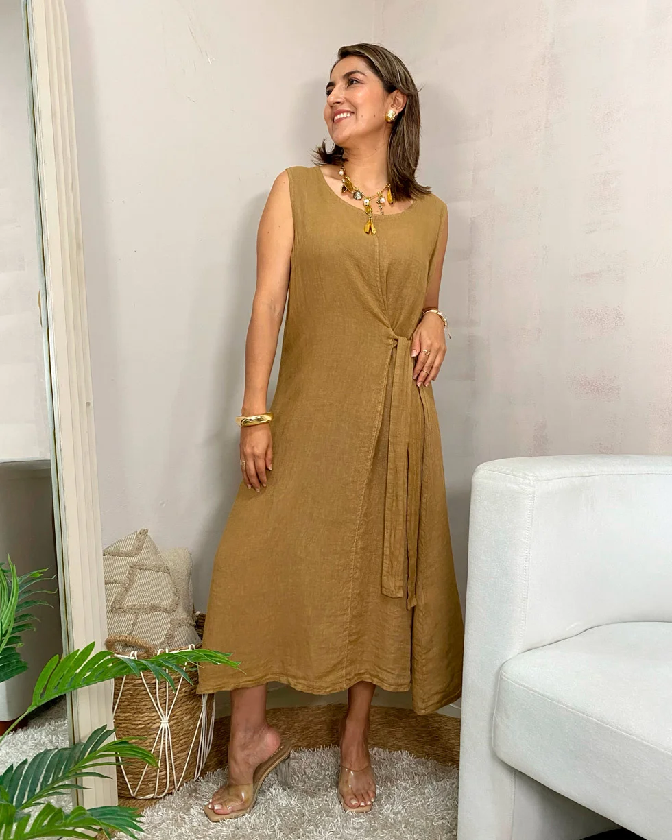 Vestido maxi en lino manga sisa cuello redondo con detalle de amarre en frente.