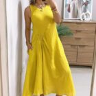 Vestido corte midi en lino 100% de manga sisa y cuello redondo con detalle encarrujado en costado y cuenta con bolsillos funcionales.