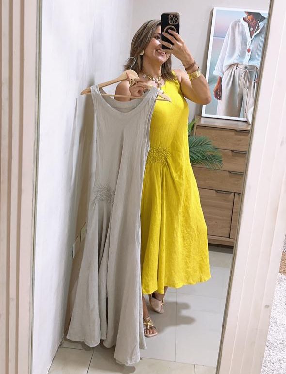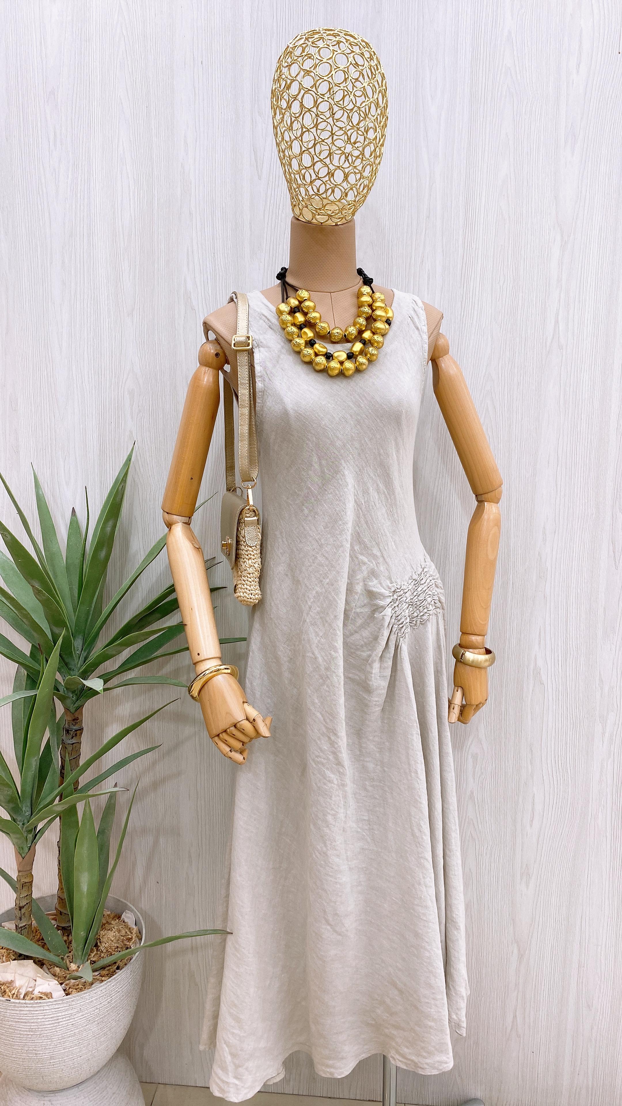 Vestido corte midi en lino 100% de manga sisa y cuello redondo con detalle encarrujado en costado y cuenta con bolsillos funcionales.