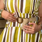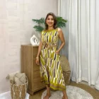 Este vestido está confeccionado en un corte sin mangas y cuello redondo, su falda amplia y fluida aporta movimiento y comodidad, luce un estampado geométrico vertical que estiliza la silueta y aporta un aire sofisticado. Incluye un cinturón trenzado que realza la cintura y aporta equilibrio a la prenda. Lo tenemos en dos tonos disponibles: Verde con beige y blanco y Marrón con beige y terracota.