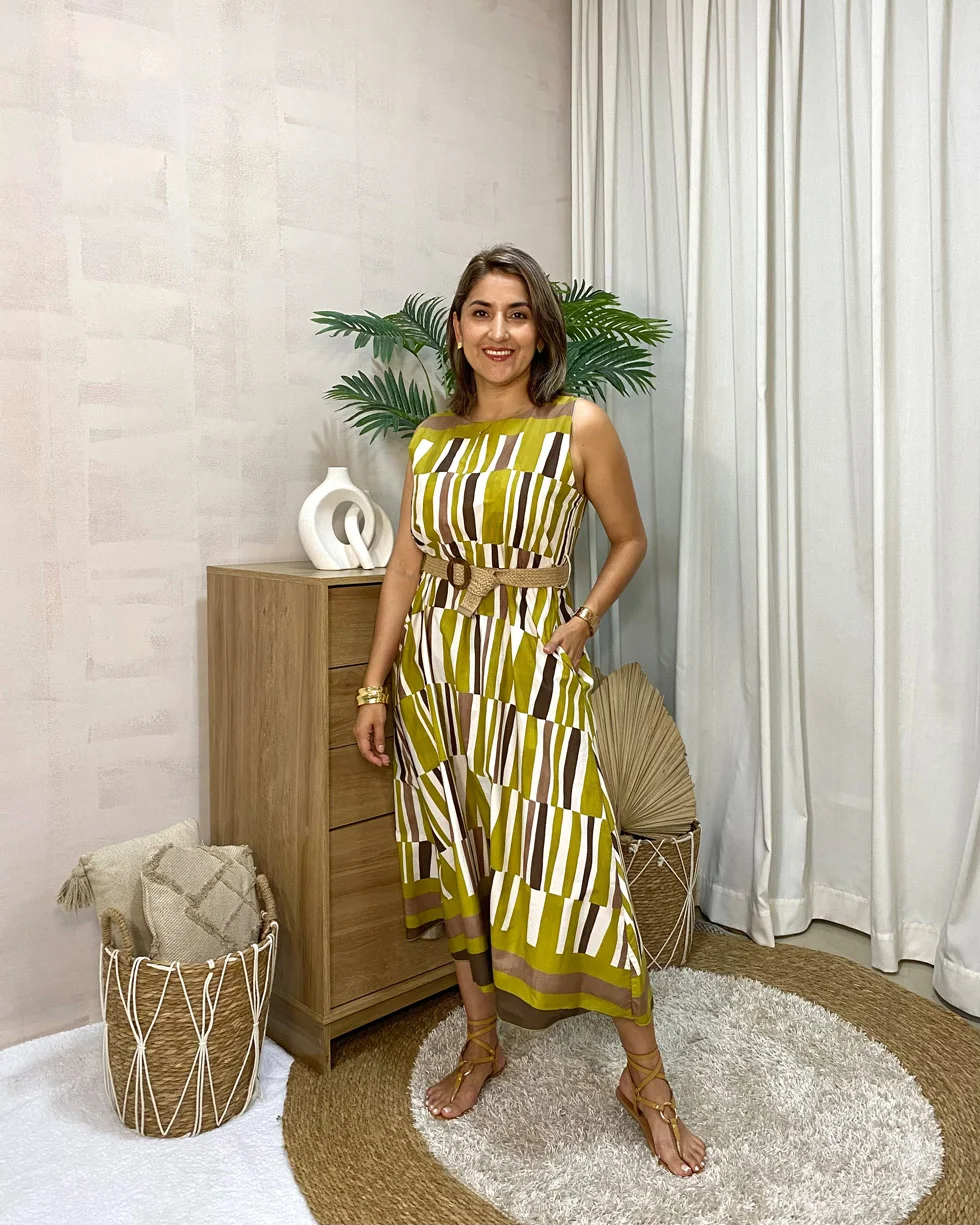 Vestido midi sin mangas con estampado geométrico, cinturón trenzado. Disponible en dos tonos versátiles.