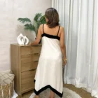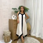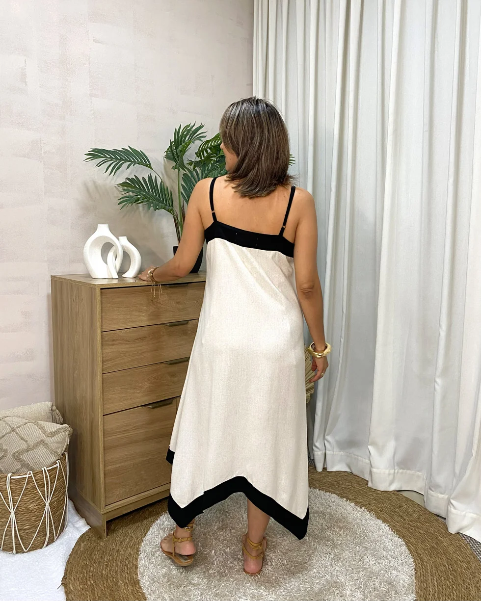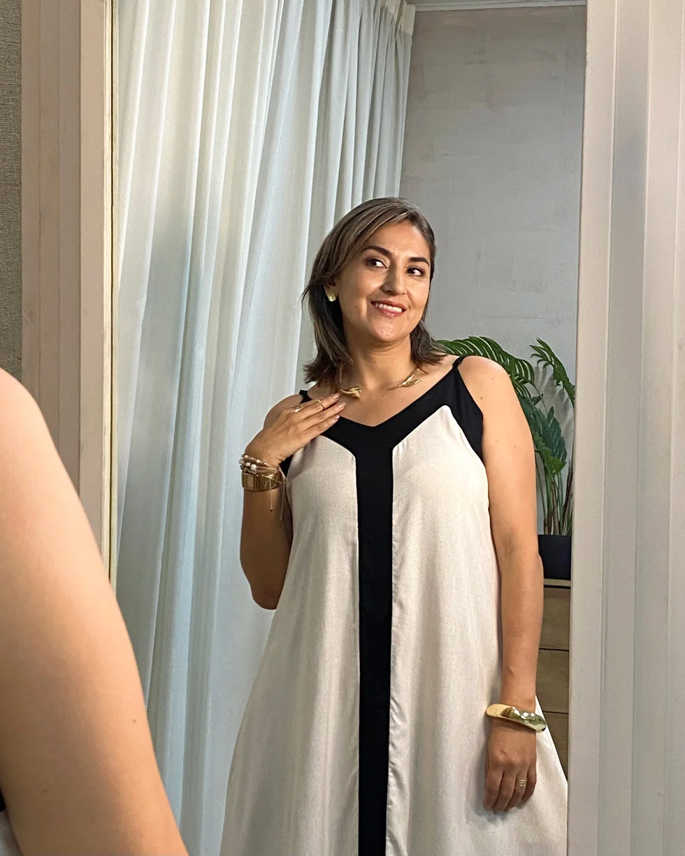 Este vestido bicolor está confeccionado en tono arena con delicados detalles en color negro, destaca por su escote en V y su corte sin mangas que aporta frescura y comodidad con un toque de sofisticación. Su dobladillo asimétrico estiliza la silueta y te permitirá lucir femenina, actual y distinguida.