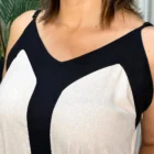 Vestido bicolor sin mangas en blanco y negro con escote en V y dobladillo asimétrico, elegante y moderno.