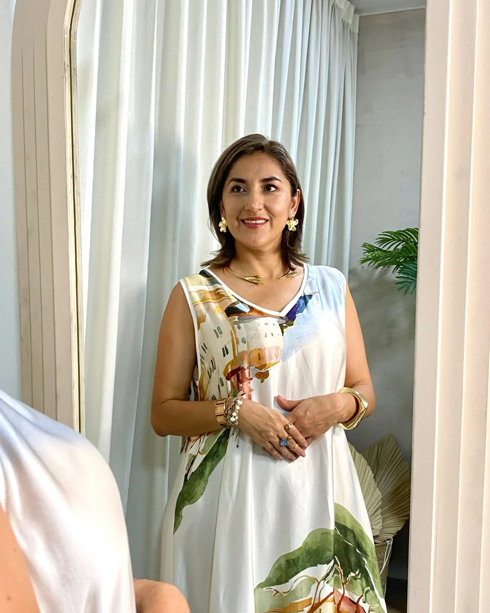 Este es un vestido largo sin mangas que se distingue por su diseño fluido y su estampado artístico inspirado en paisajes coloridos que transmiten frescura a tu outfit. Su tela ligera lo convierte en una prenda ideal para climas cálidos, mientras que su diseño versátil permite usarlo tanto de día como de noche. Un vestido que combina moda, confort y elegancia en una sola pieza.