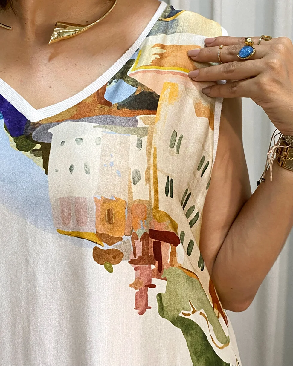 Vestido largo sin mangas con estampado artístico, fresco y elegante.